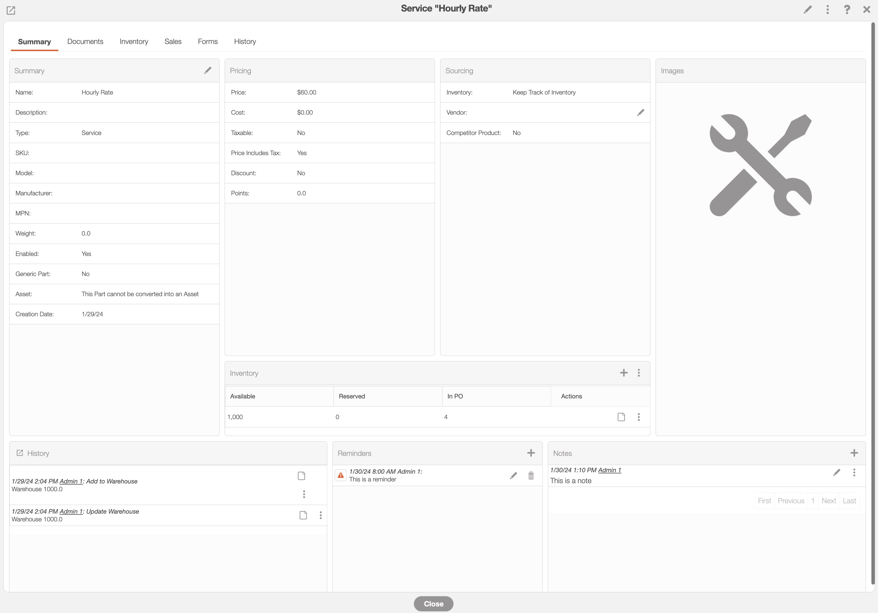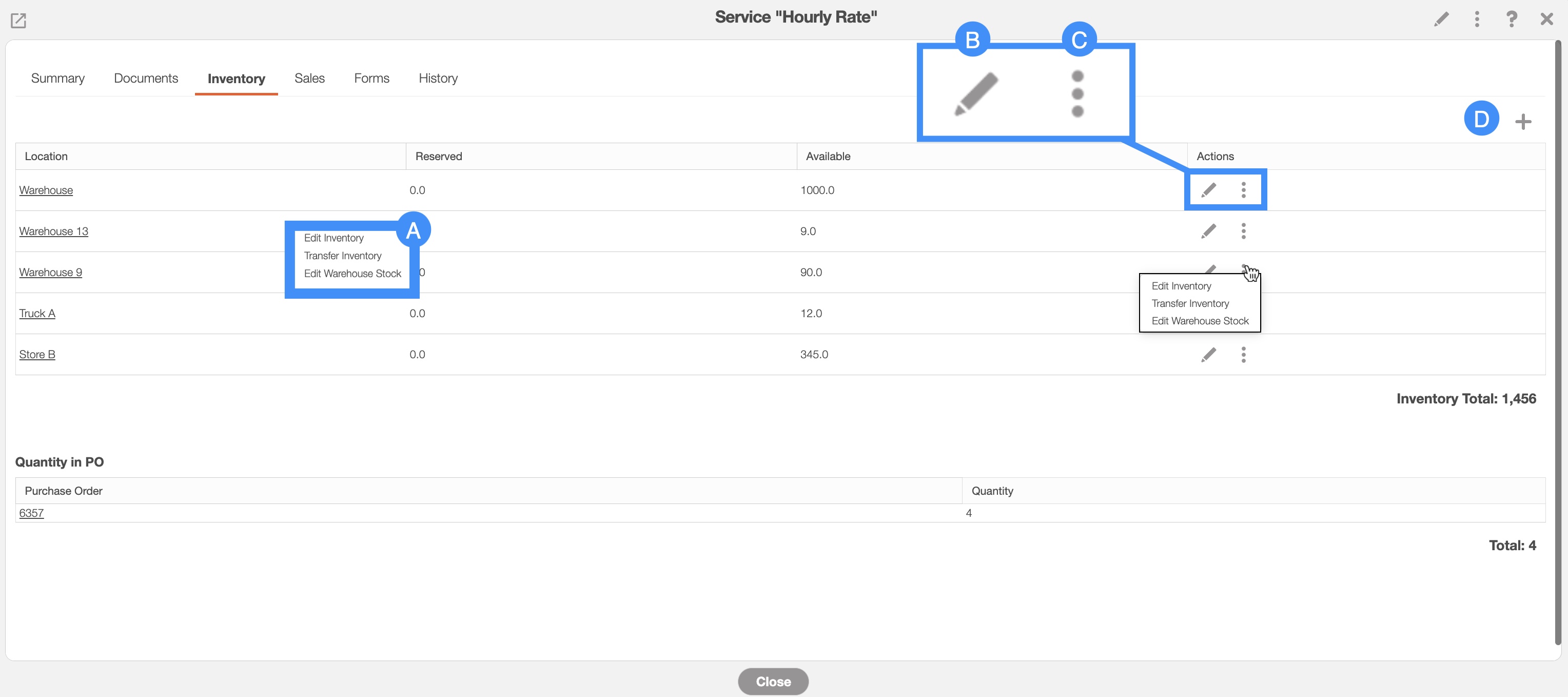 The "Inventory" panel will list the total inventory of the service, as well as the reserved total, and purchase orders.