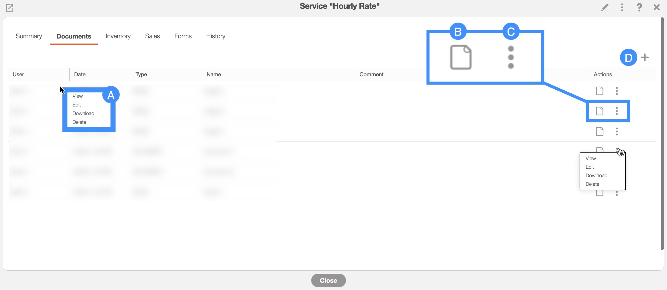 The "Documents" tab will allow you to store service-specific documentation (e.g., contracts, photos, etc.) for future use. This tab will also list the type of document file, the date it was uploaded, the user who uploaded it, and more.