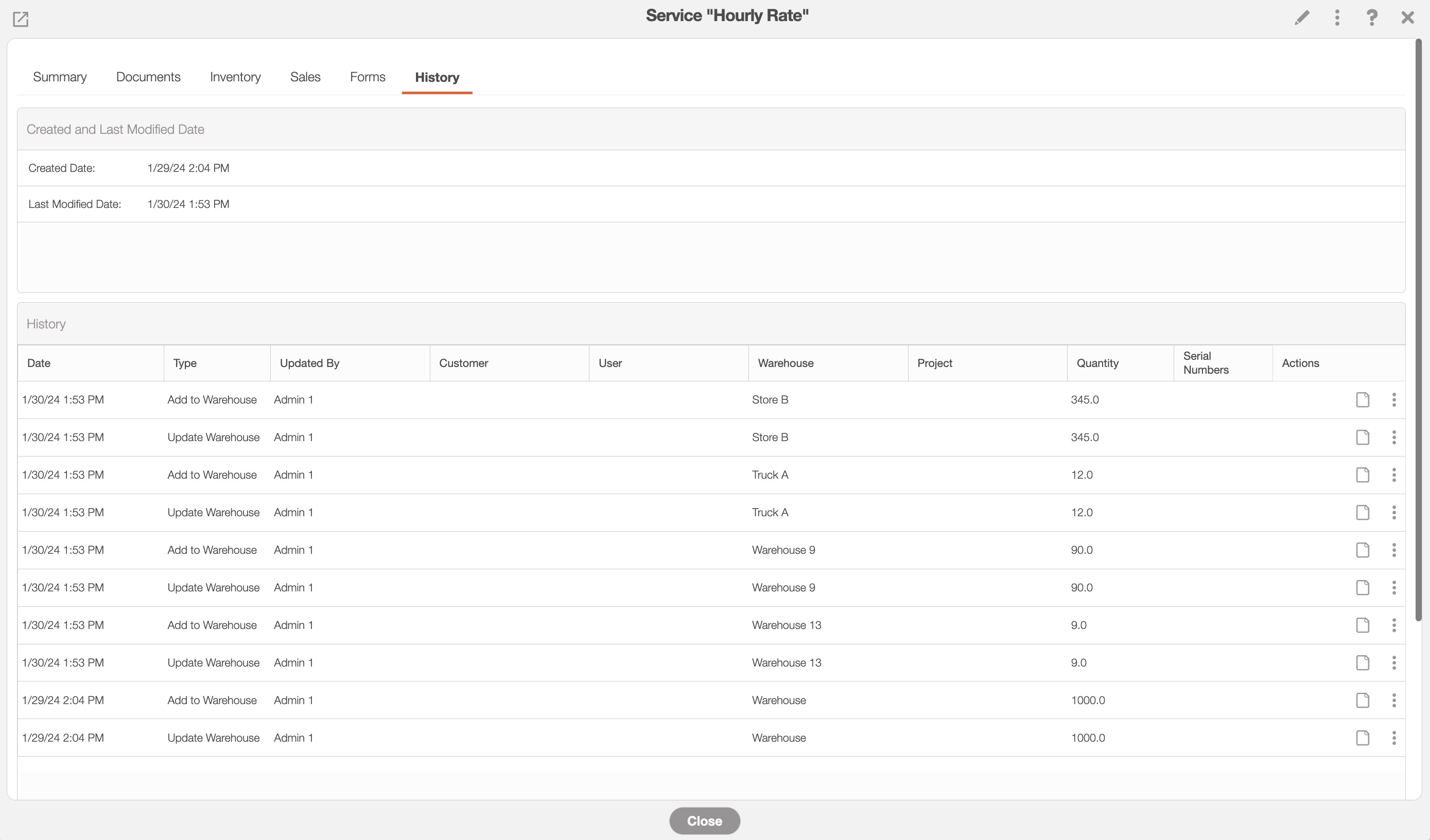 The "History" panel will contain the historical data of the service (e.g., warehouse updates and more). The data in this box will automatically generate when a specified event or status is reached.