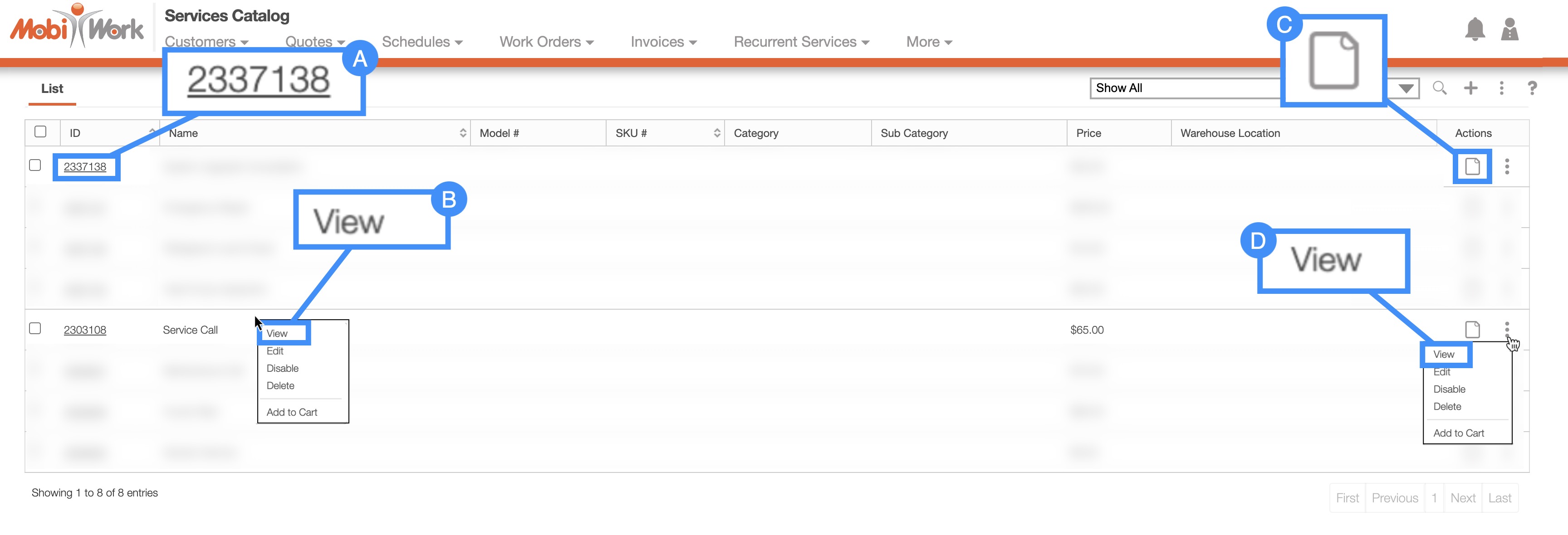 Once you are on the "Service List (Catalog)" tab, there are four different ways to access the View Service pop-up window: