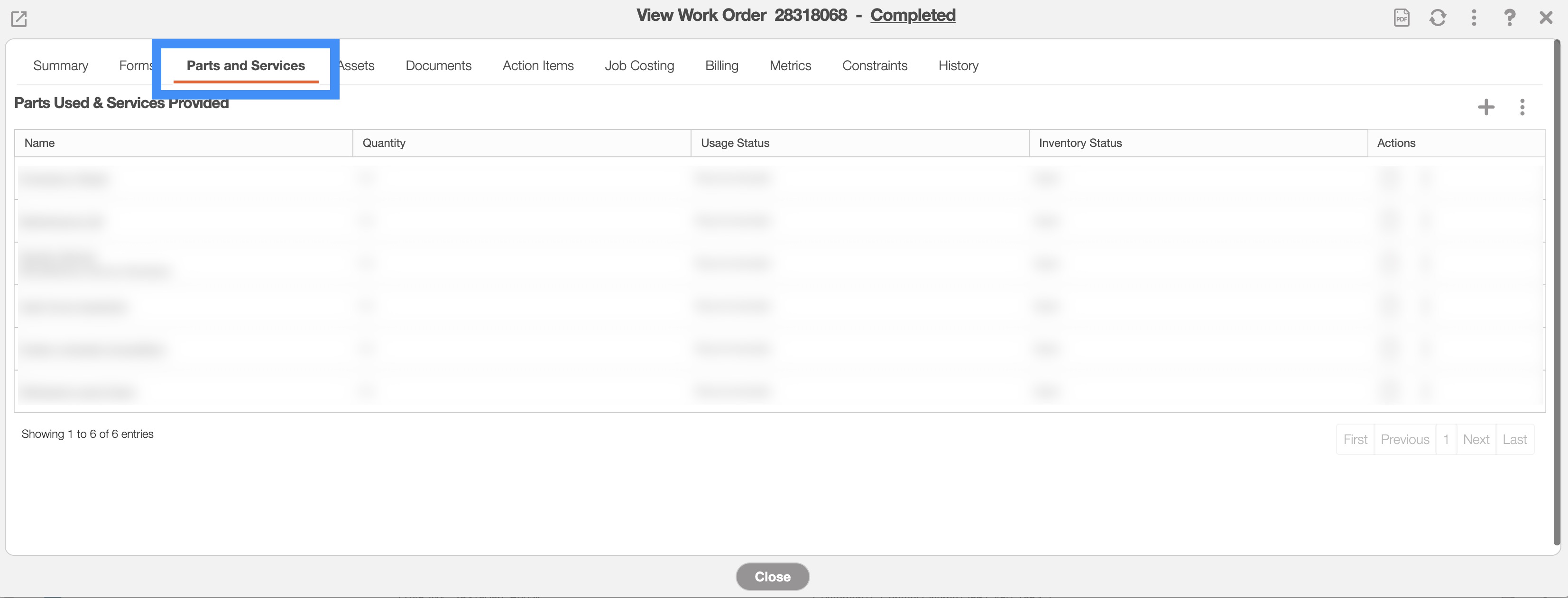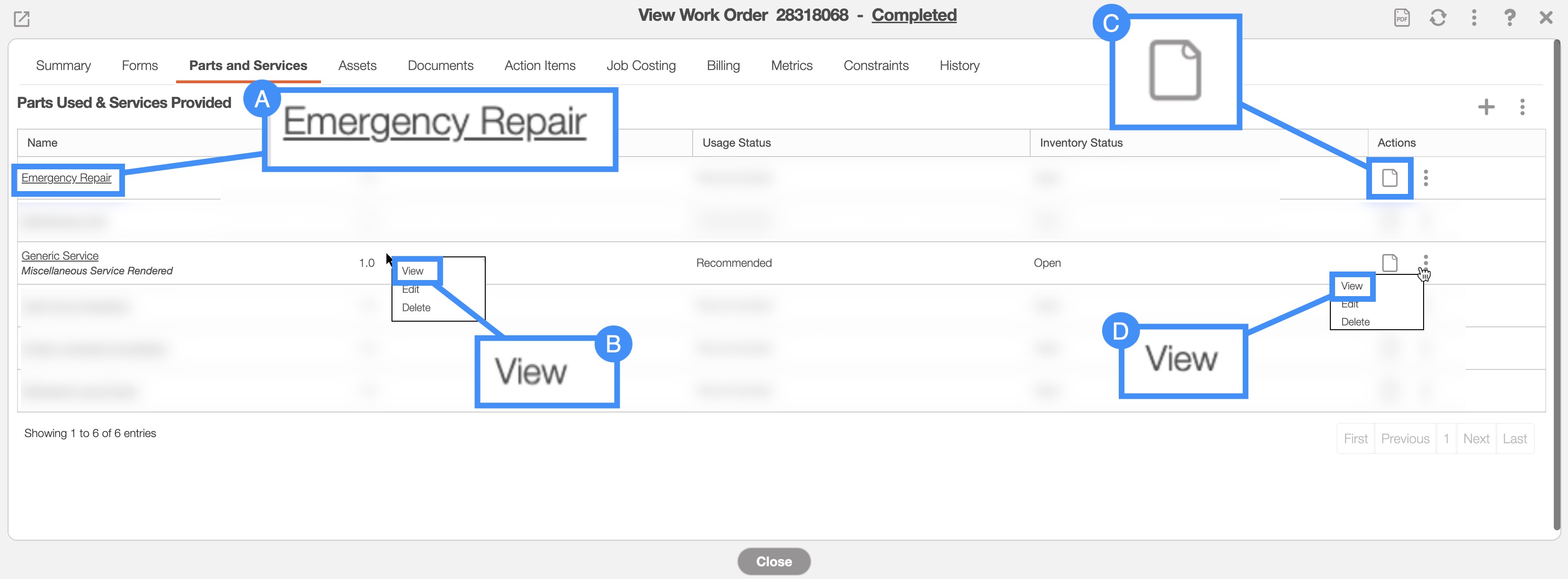 All the parts and services associated with the work order will be displayed on these tabs. To access an individual service and open its View Service pop-up window: