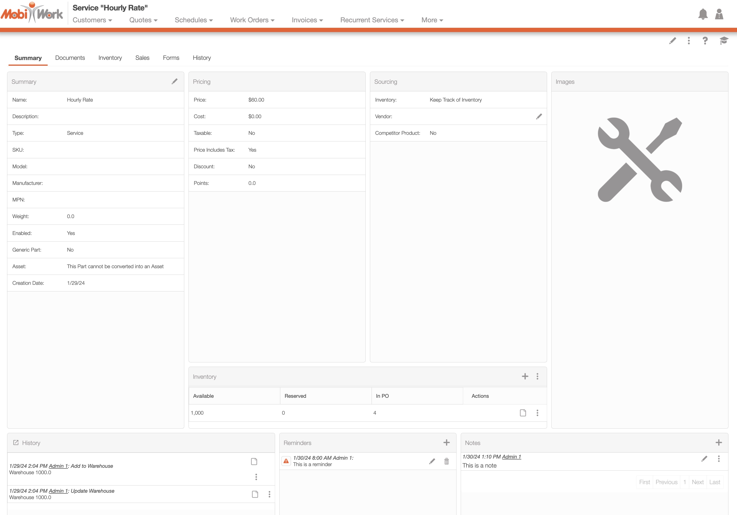 The panels found on the "Summary" tab will summarize the data from the other View Service tabs, pricing details, reminders for selected users, the image of the service, and more: