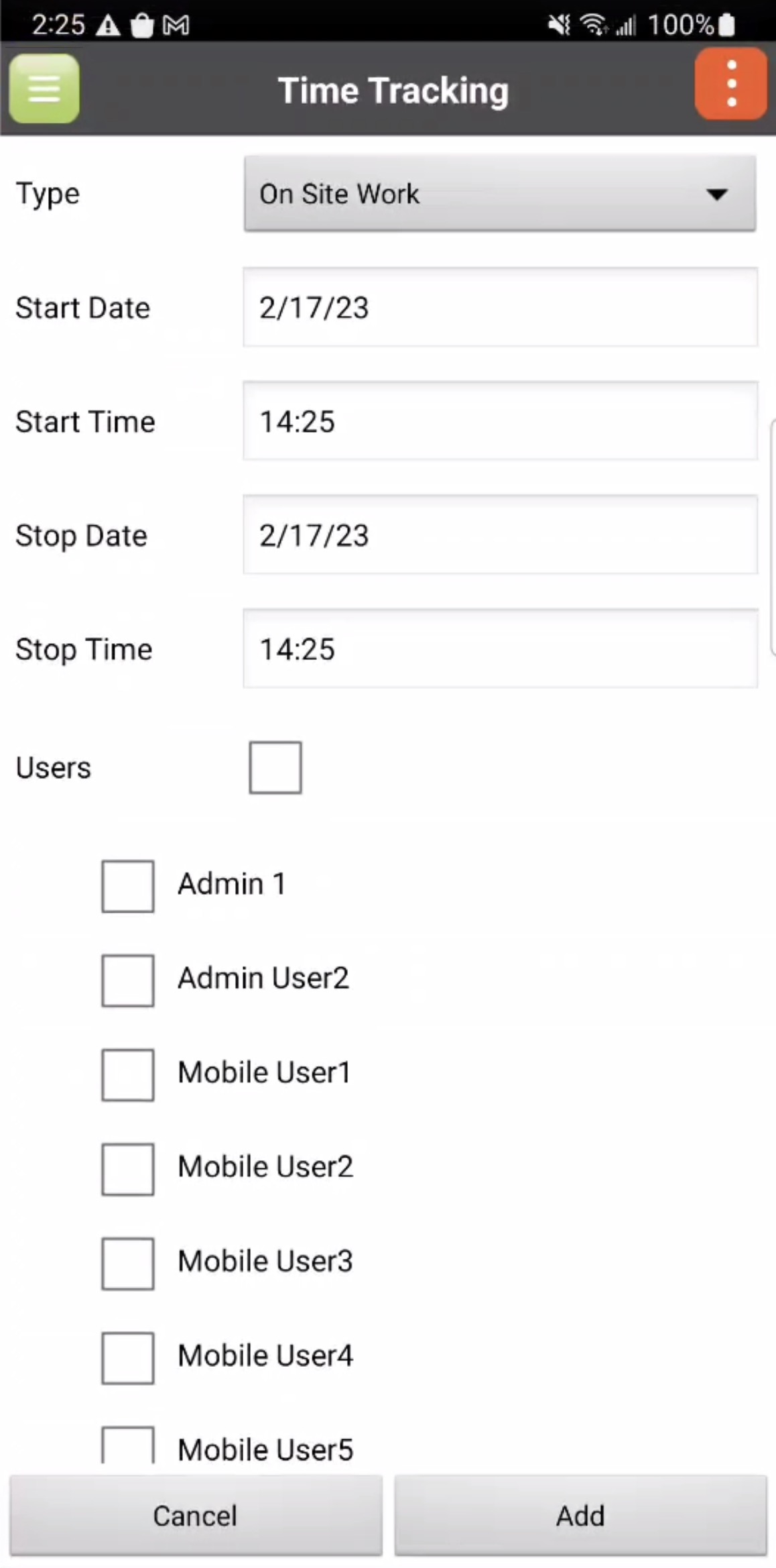 While out in the field you can adjust the hours that you or your users worked. With the Time Tracking feature, you can add the start date/time and the end date/time of selected users.