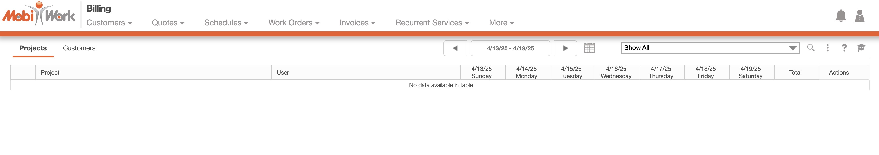 You will be able to access the List View for the time tracking billing by hovering over the Time Tracking feature on the MobiWork menu. From the drop-down, select the "View Time Tracking for Billing" option: