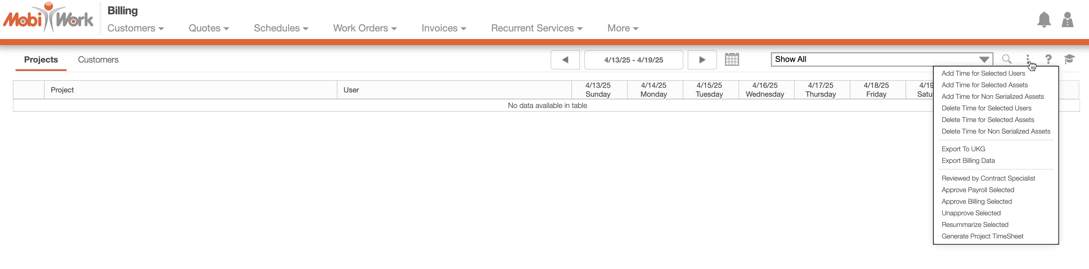 If you click on the the More Actions in the upper right corner, you will be able to access additional billing actions. These actions will apply to all the selected time tracking billing entries:
