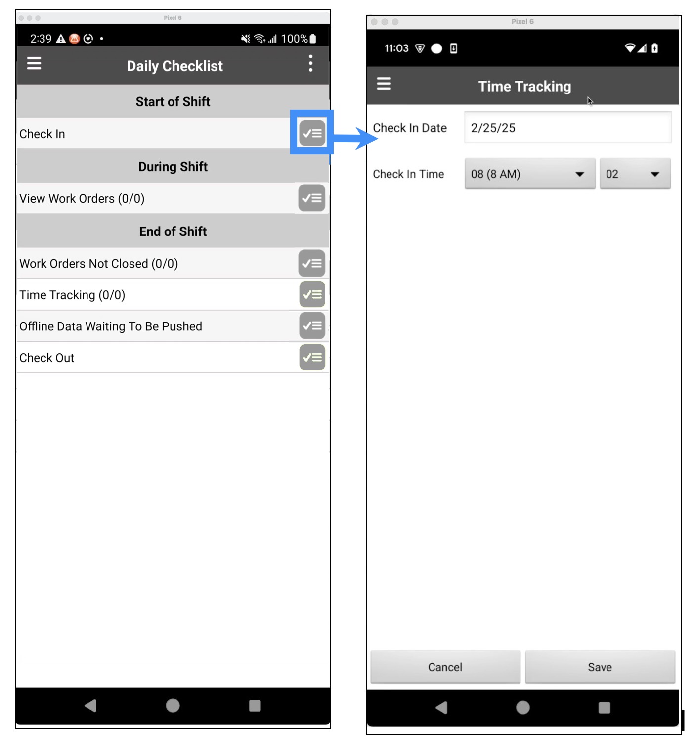 Once you are on the Daily Check List page, you will be able to access the Check In/Out feature.. We recommend this method for checking in and out: