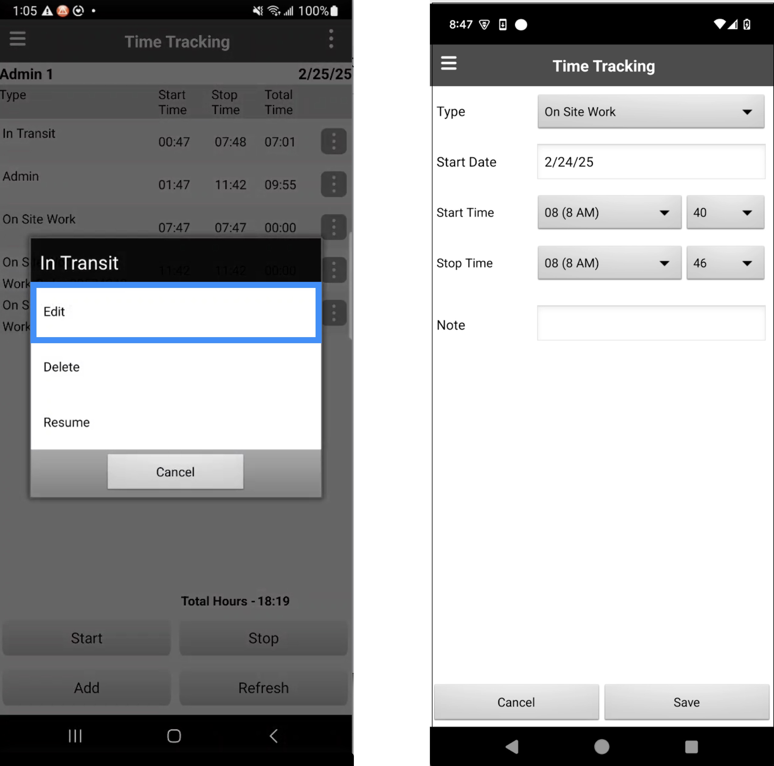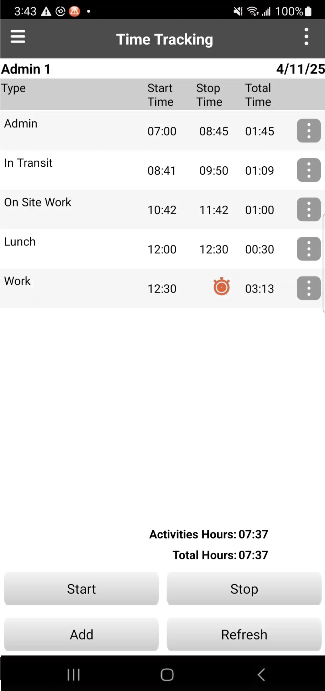 MobiWork time tracking features can be used to capture the time on a per user basis or for multiple users at a time (crews) both from the web or from the device.