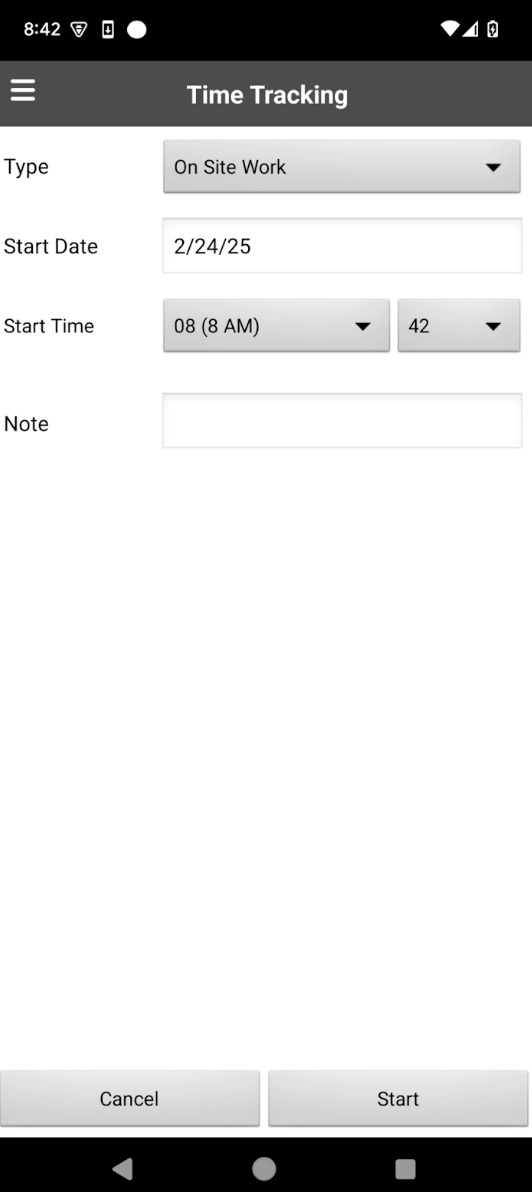 Also, if enabled in the settings, the system will also capture the Cost Code and Billing Code- though both will default to empty if not specified. Additionally, Projects will not appear by default; instead, you will need to start from the project itself or from a work order linked to it.