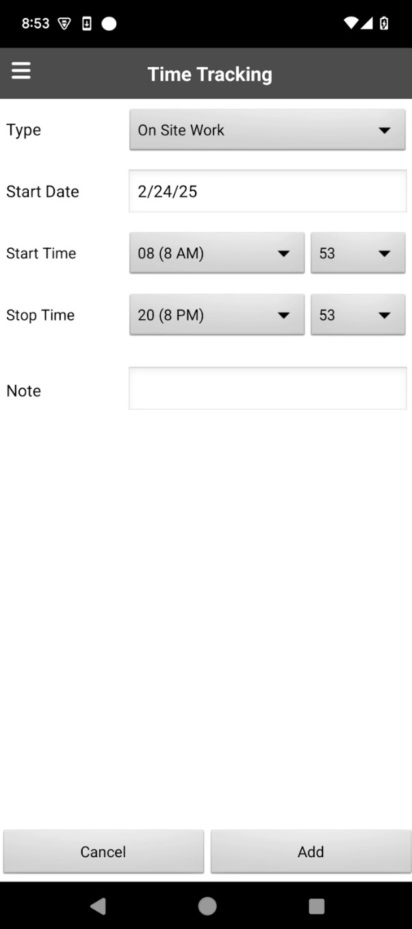 Once you are ready to enter the time tracking for the activity, press the Add button.