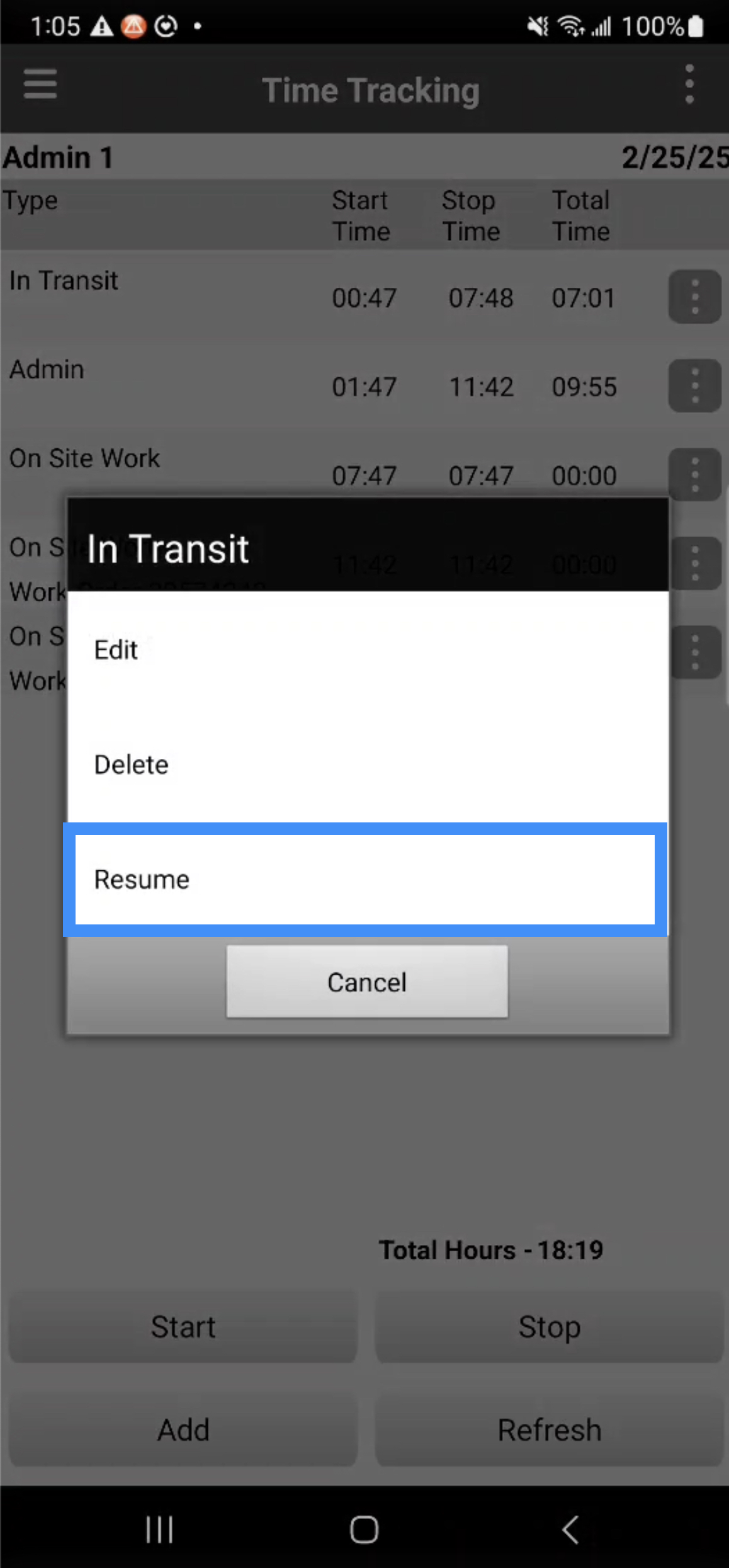 By pressing on the Individual Actions of the selected time tracking, you will be able to access the "Resume" action: