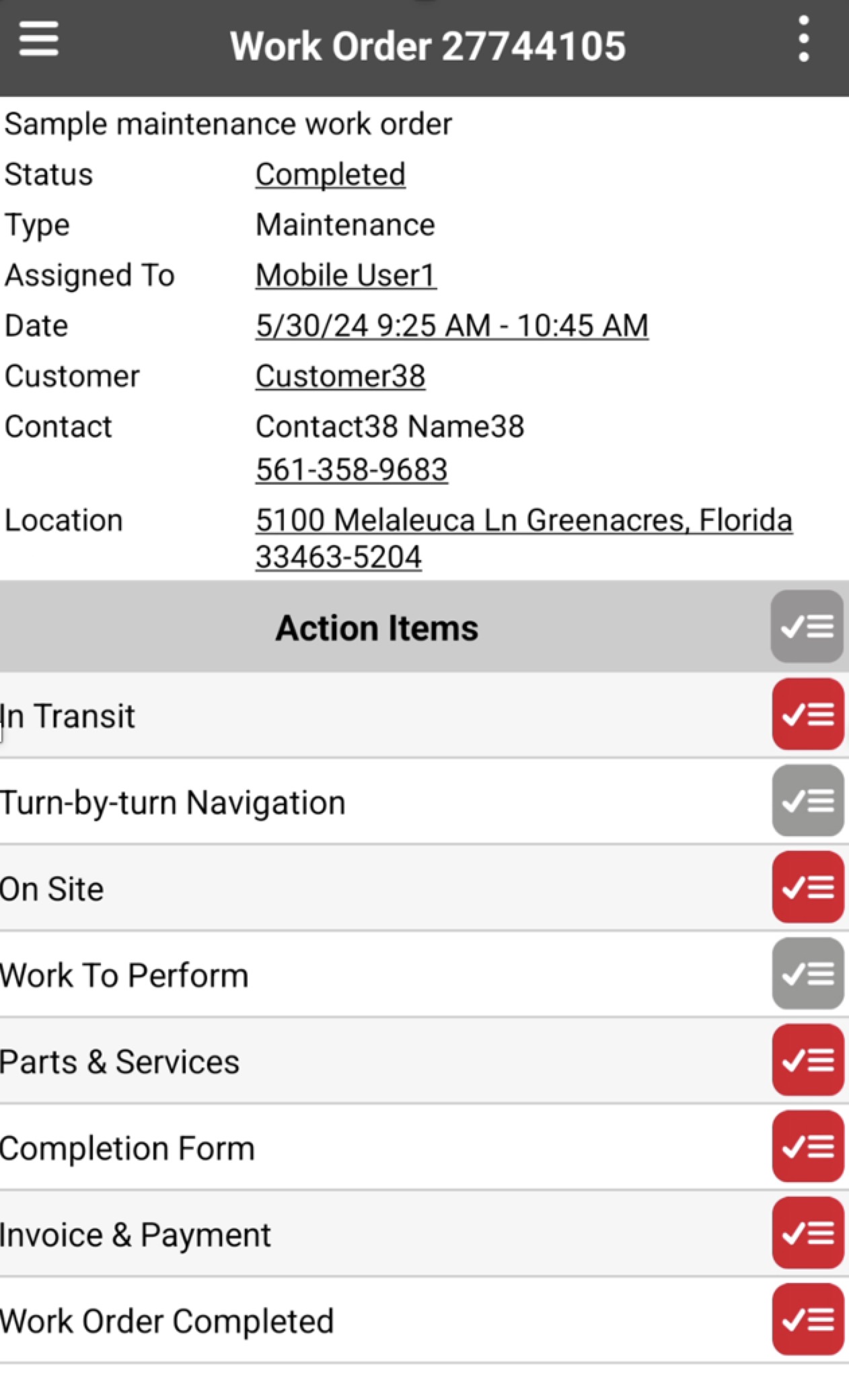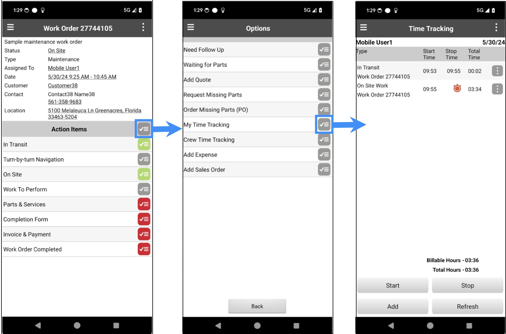 The MobiWork work order action items automatically keep track of the time spent in transit and on site. Just toggle the action items and MobiWork will do the rest: