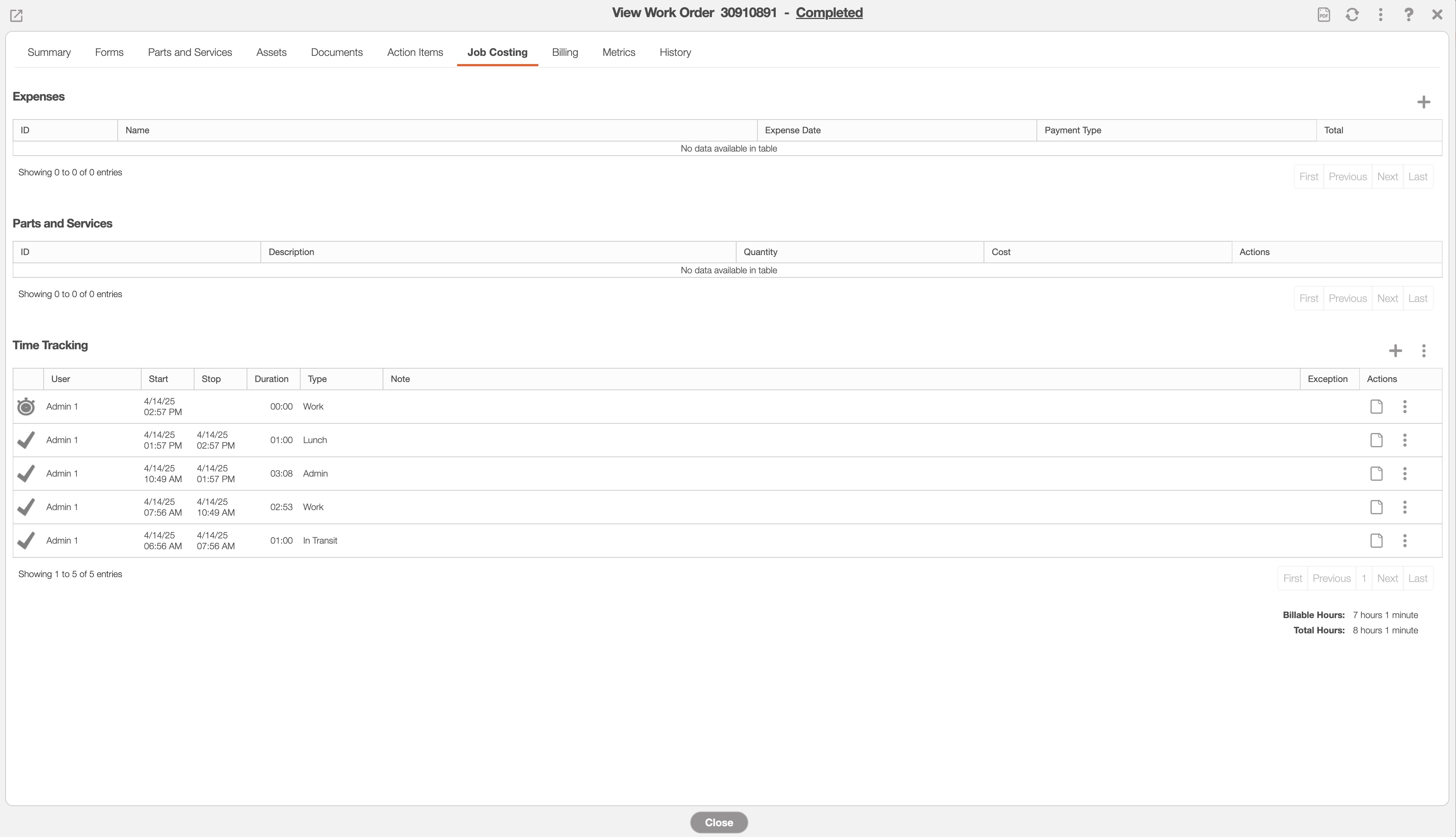 The corresponding time tracking entries are automatically added to the "Job Costing" tab of the work order: