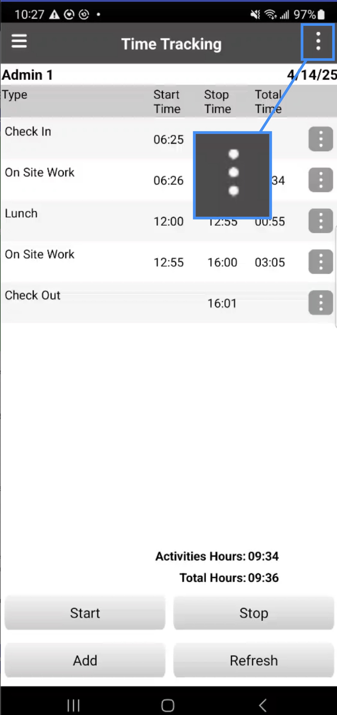 To check in or out from the Time Tracking panel, click on the Individual Actions in the from the upper right corner of the Time Tracking panel: