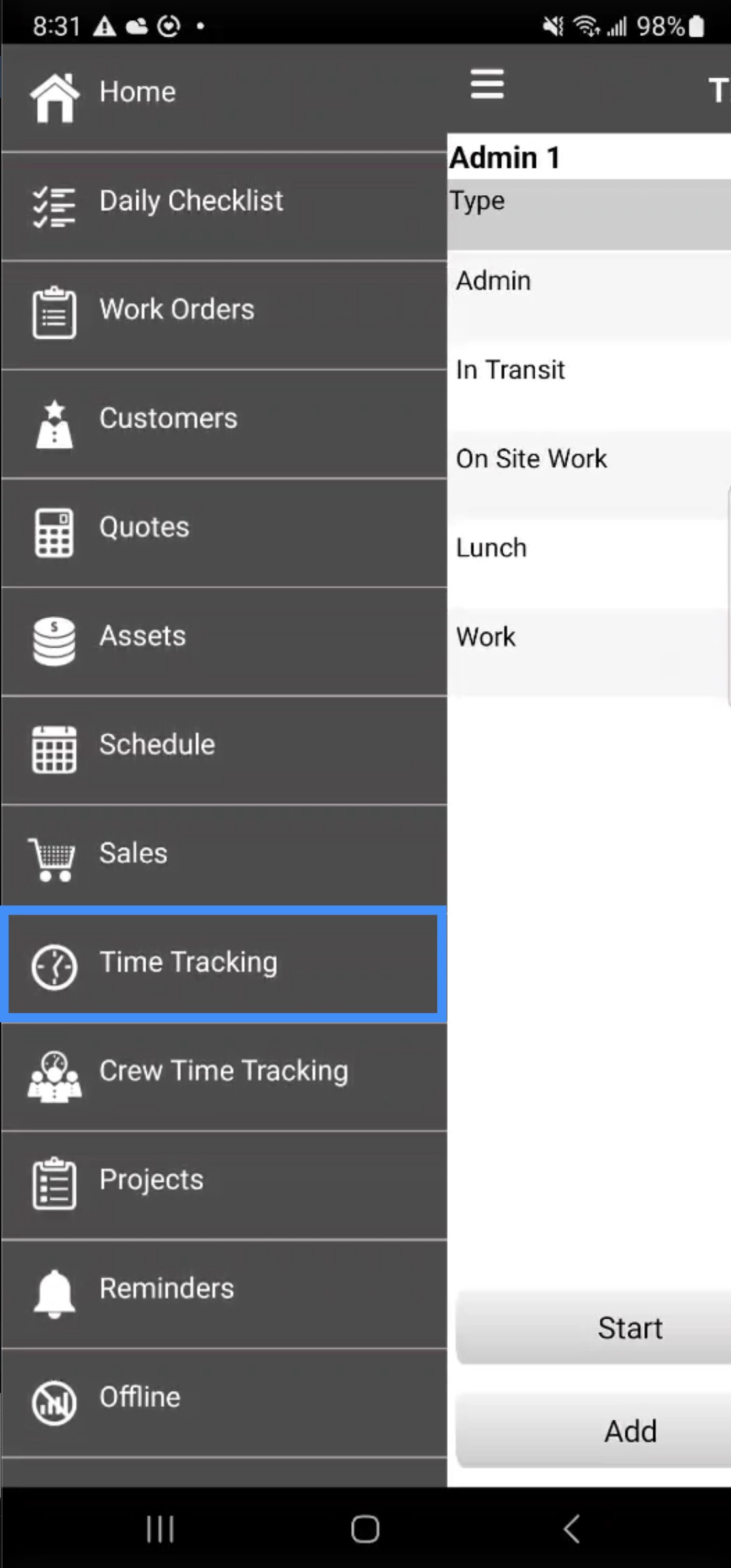 You can access the Time Tracking feature from the device's side panel to manage your time tracking, including starting a time tracking activity:
