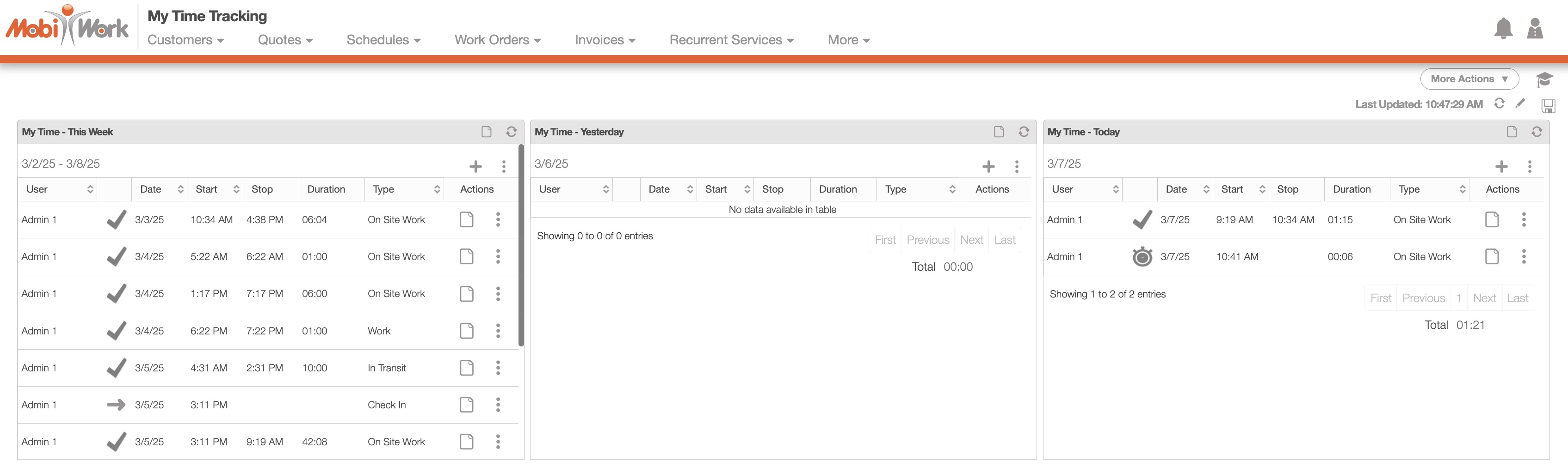 The Time Tracking dashboards provide a centralized view of your and other users' time tracking across all work orders and customers. With dedicated panels for weekly and daily time tracking, you can easily monitor and manage logged hours.