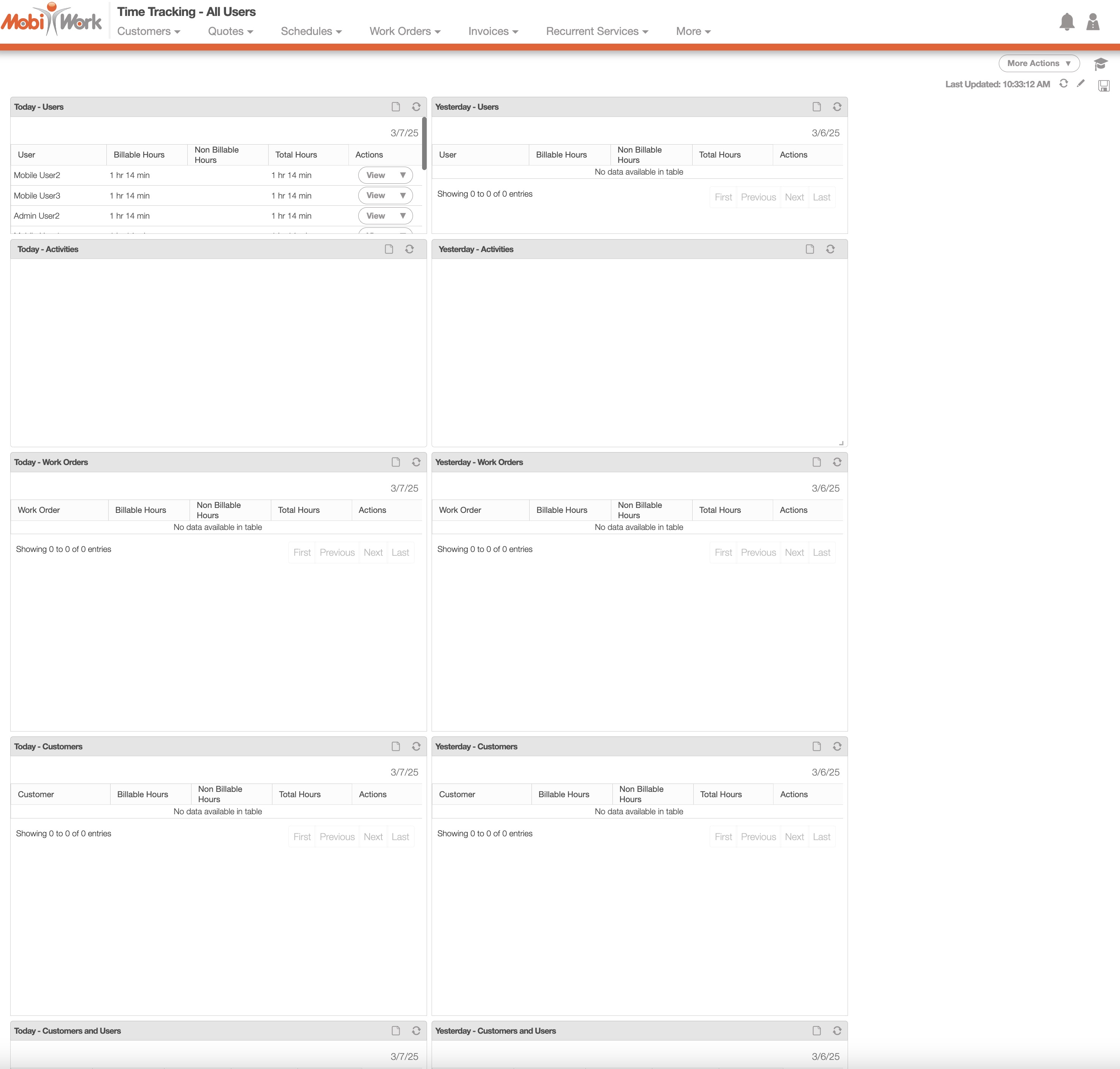 The "Time Tracking - All Users" dashboard provides a comprehensive view of time tracking across all users, work orders, and customers, offering valuable insights into workforce activity and productivity: