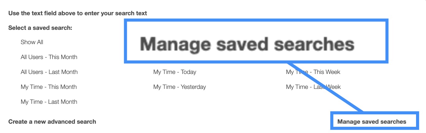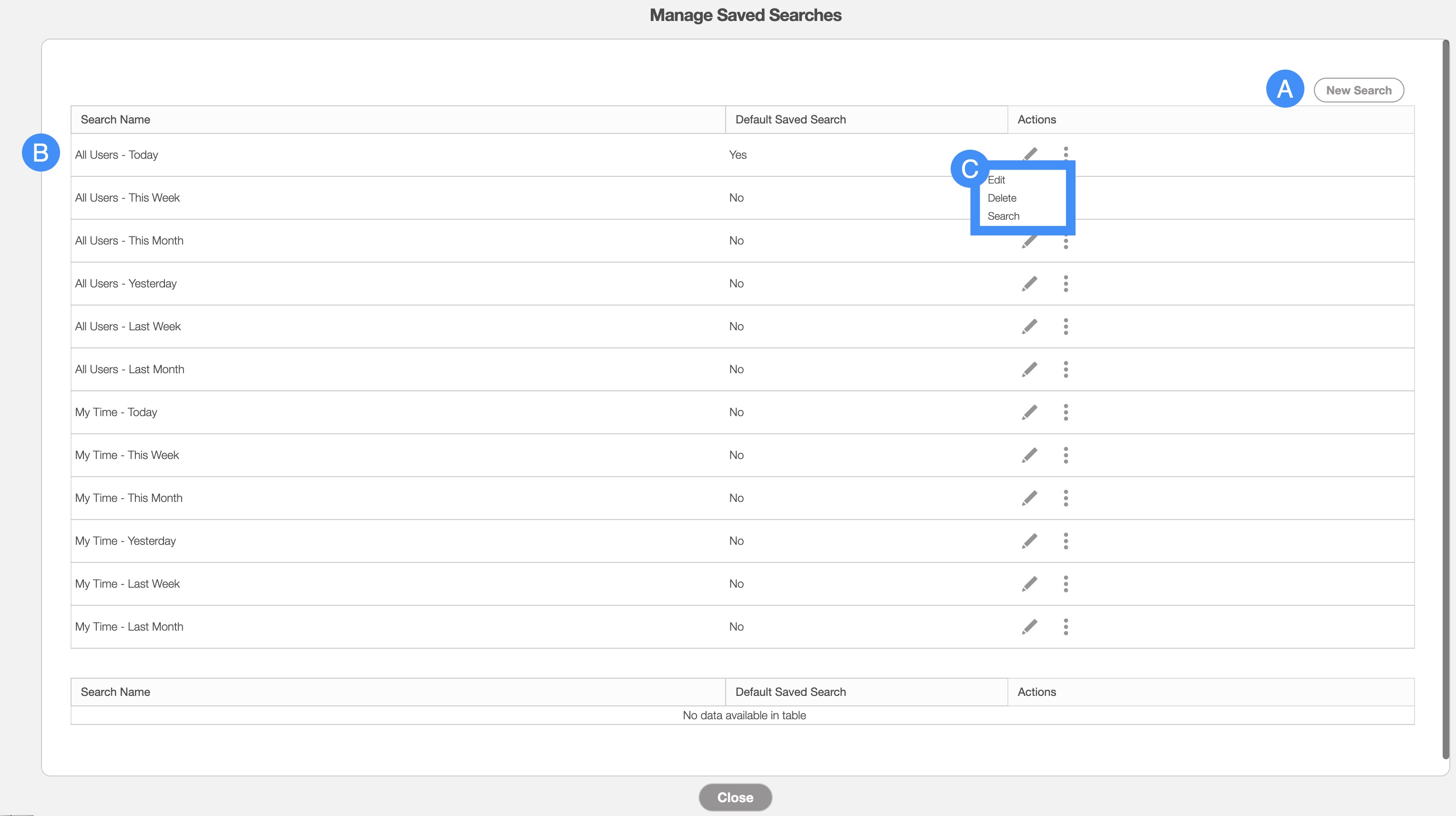 Any new searches that are added can be managed or edited in the Manage Saved Searches pop-up window: