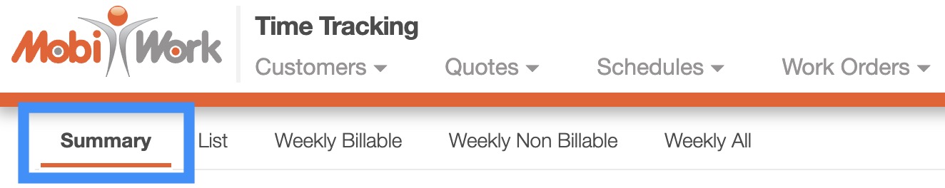 The layout of the "Summary" tab is below. This tab is the default tab you will be redirected to once you access the Time Tracking feature: