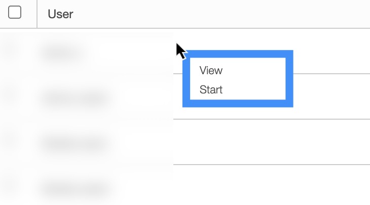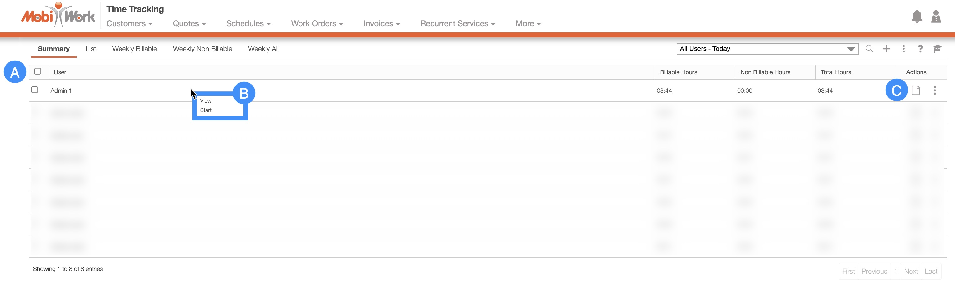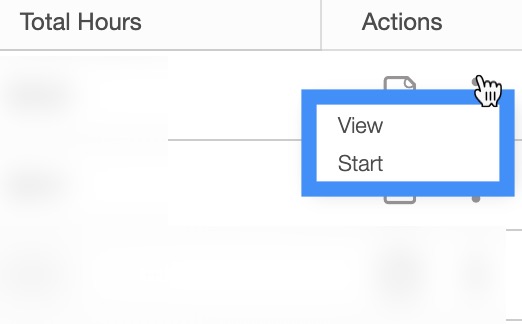 When selecting a user and clicking on the Individual Actions button (the three vertical dots under the "Actions" column) you will be able to view or start the selected user's time tracking.