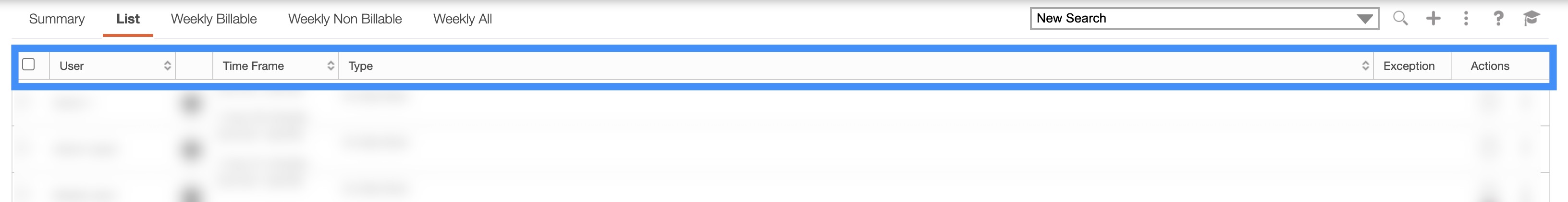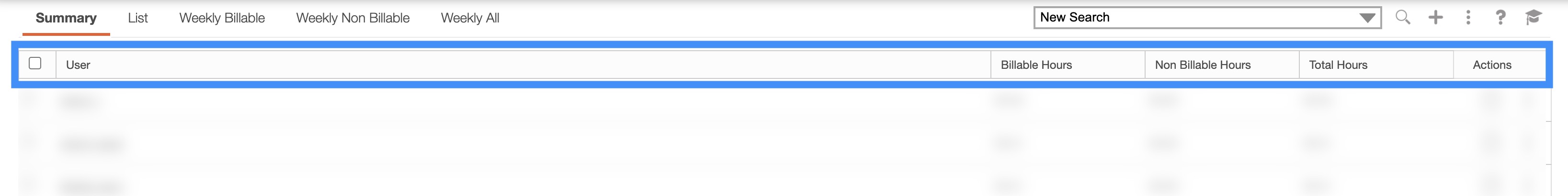The corresponding rows under the column headings will display the relevant user time tracking data.