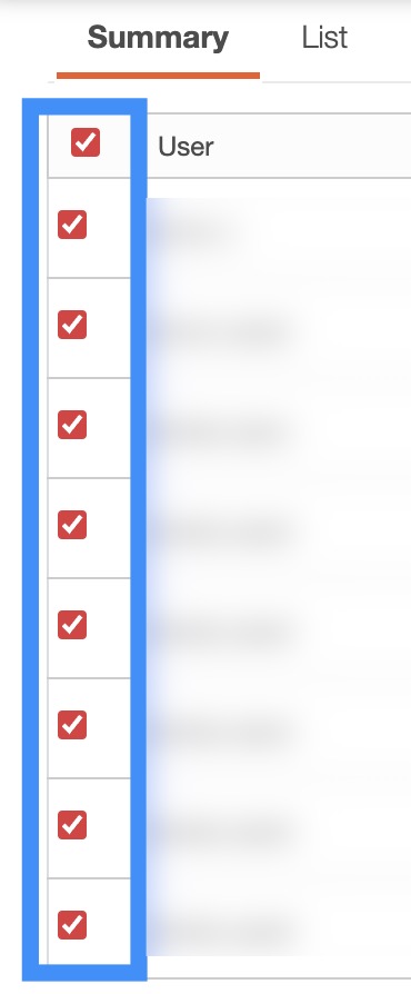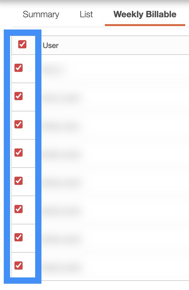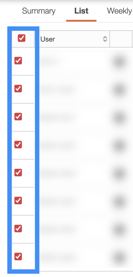 The checkboxes (multiple selection area) found to the left of the "User" column, will allow you to select either one or multiple users to start, add, or export their time tracking: