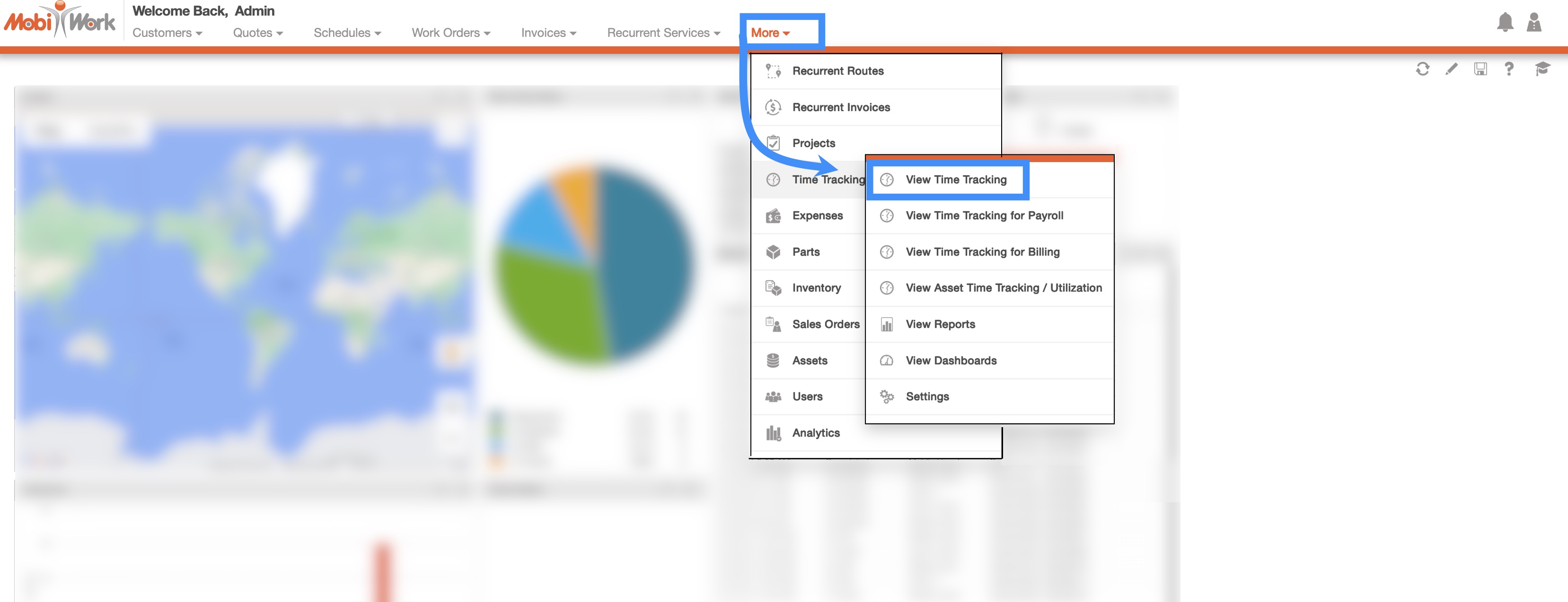 You can access the Time Tracking feature page by hovering over the Time Tracking feature from your MobiWork menu and clicking on the "View Time Tracking" option: