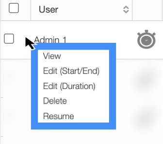 When selecting a user and clicking on the Individual Actions button (the three vertical dots under the "Actions" column) you will be able to view, edit, or delete the user's time tracking. If the "Time Tracking Icon" column has a Clock icon, then you also have the option to stop the ongoing hours.