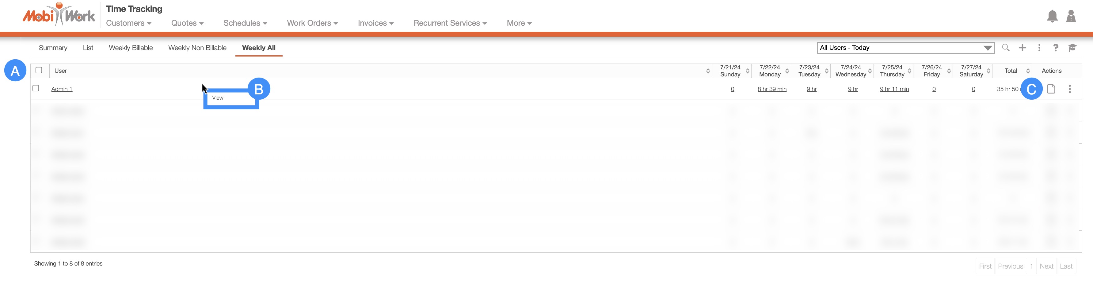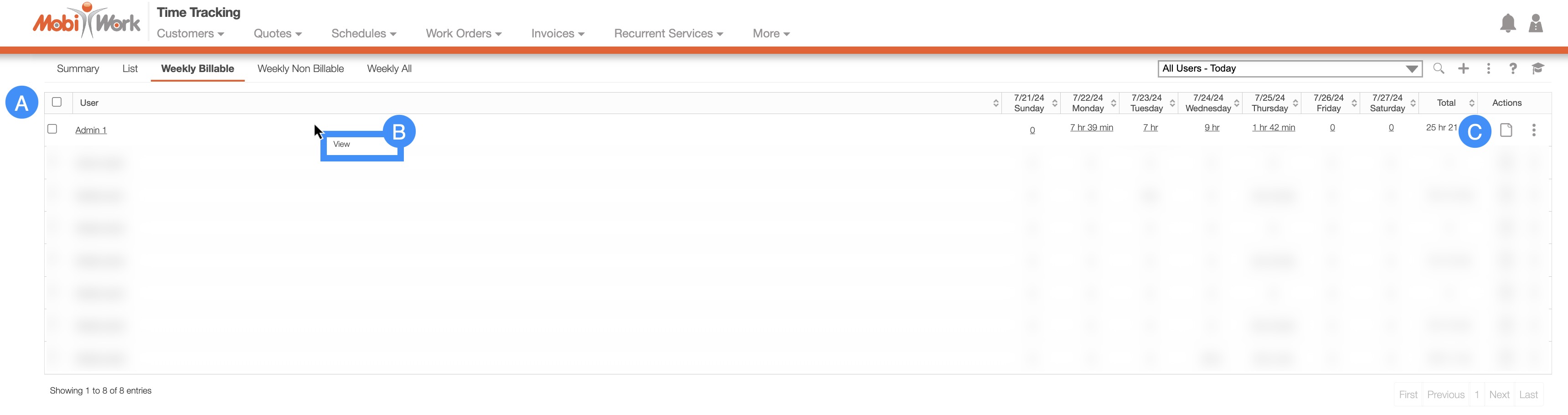 The "Weekly All" tab allows you to view all the billable and non-billable hours that your users worked during the week: