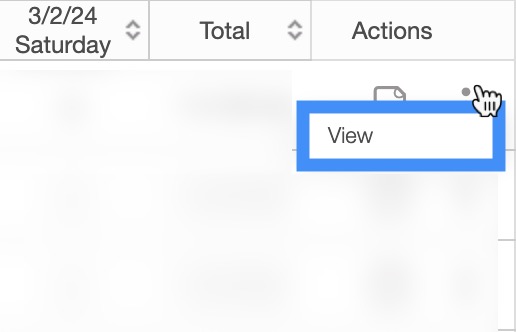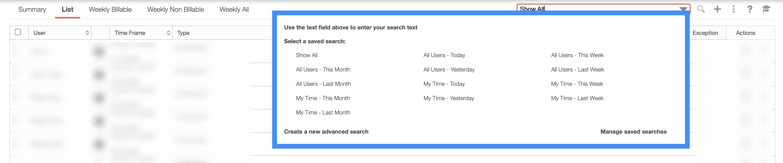 The View icon found under the "Actions" column will allow you to quickly access the View Time Tracking Entries pop-up window of the selected user: