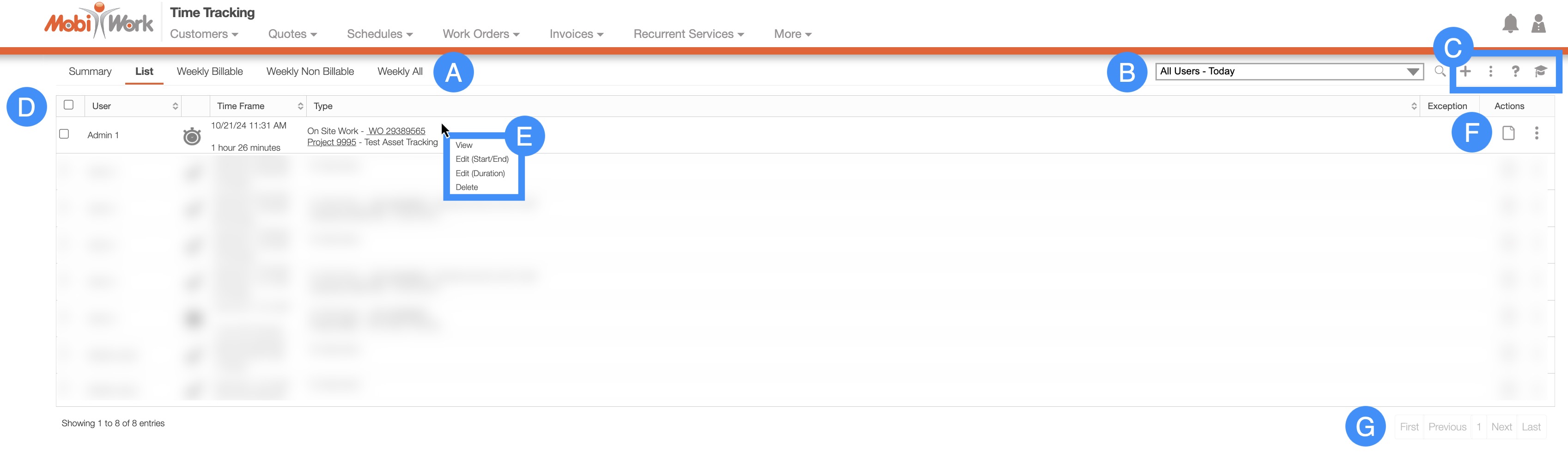With MobiWork's Time Tracking feature page, you can elevate your workflow to new heights of productivity and precision. From the Time Tracking feature page, you can view over your user's time tracking, export their time tracking, as well as manage or edit their time tracking.