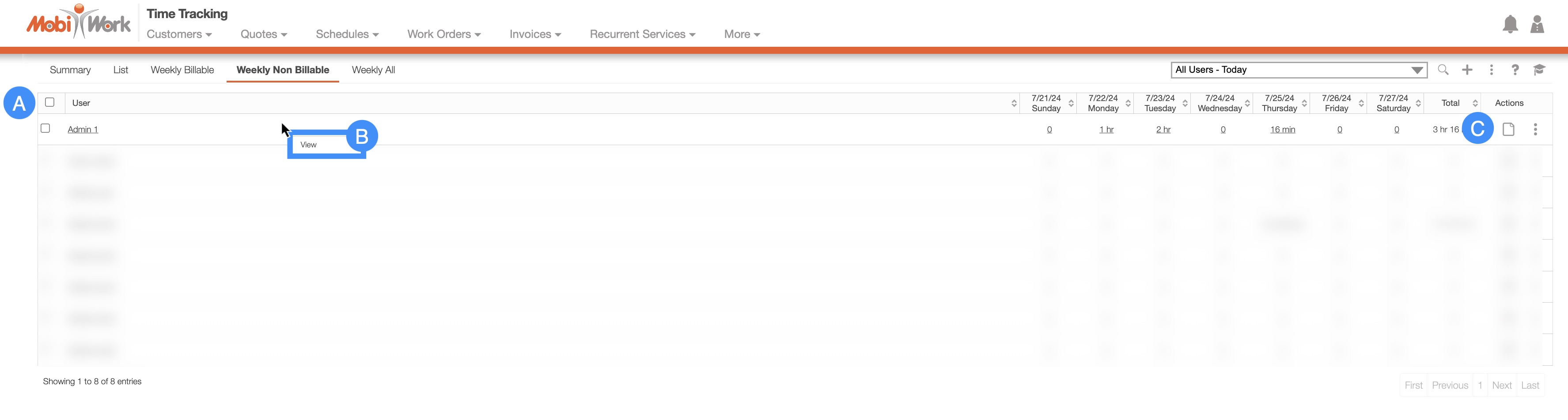 The "Weekly Non-Billable" tab allows you to view all the non-billable hours that your users worked during the week: