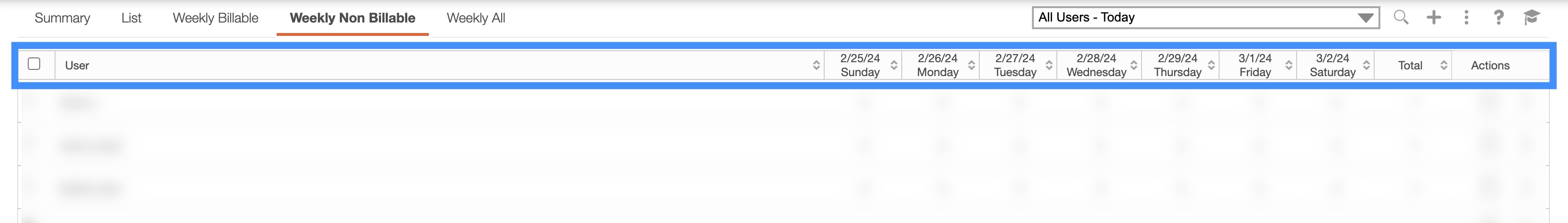 These columns are organized by the user's name, the respective dates of the week, and the total non-billable hours worked:
