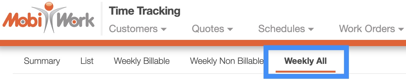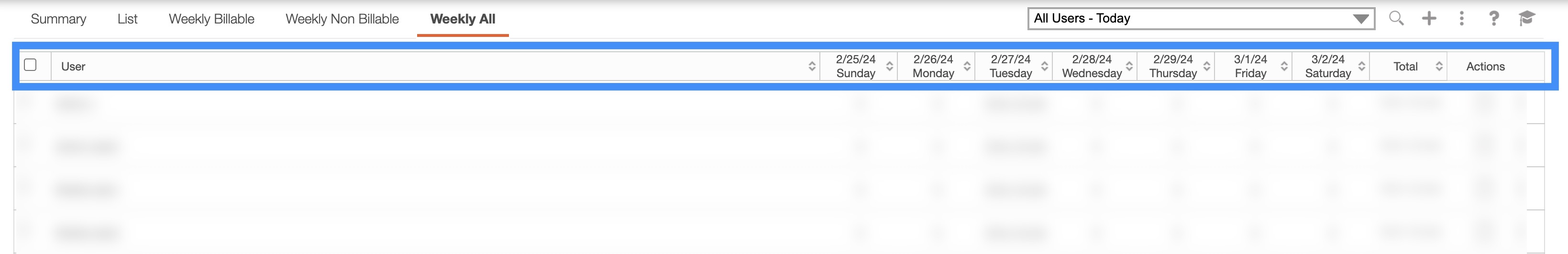 In the "Weekly All" tab, the columns are structured to display the dates of the week as well as any non-billable and billable hours that the user has worked: