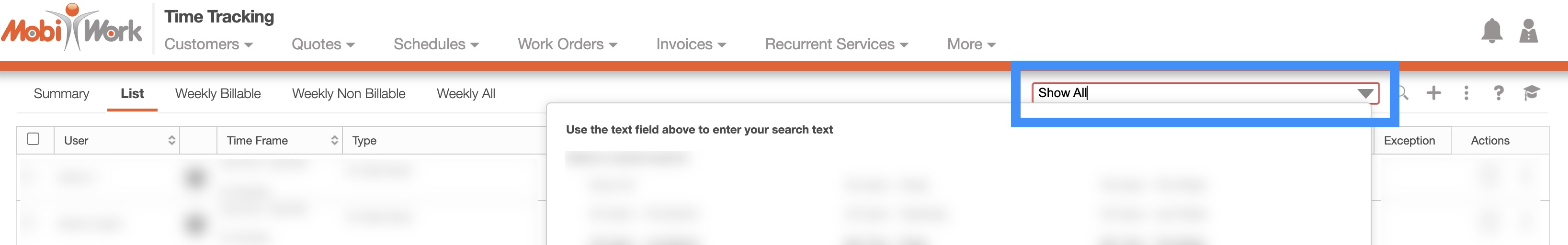 If you would like to view all your users' time tracking for the day, click on the "Show All" option from the drop-down menu: