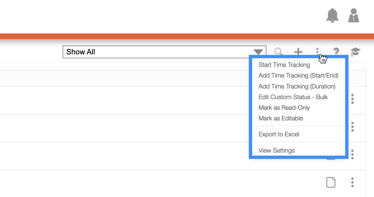 | "Edit Custom Status - Bulk" | Edits the custom status of the selected time tracking entries. This action is only available in the "List" tab's More Actions button. |
