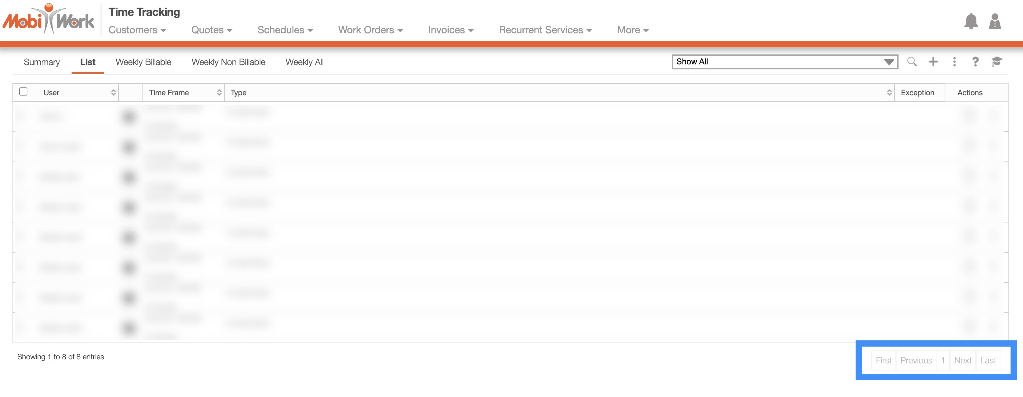 To navigate through these pages, use the First, Previous, Next, and Last buttons located towards the bottom of the Time Tracking section:
