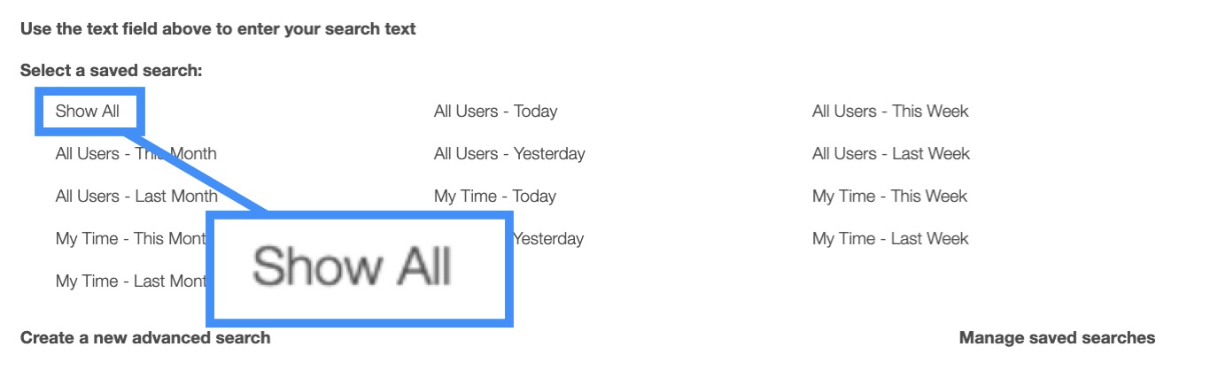 Saved searches are a powerful search tool where the search-criteria has been saved for future use. The default saved search for Users is the "Show All" search.