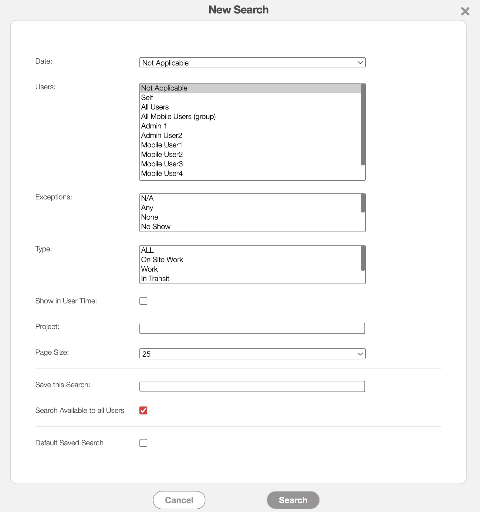 | "Users" | Allows you to select either the user(s) or group(s) whose time tracking you would like to view in the search parameters. |