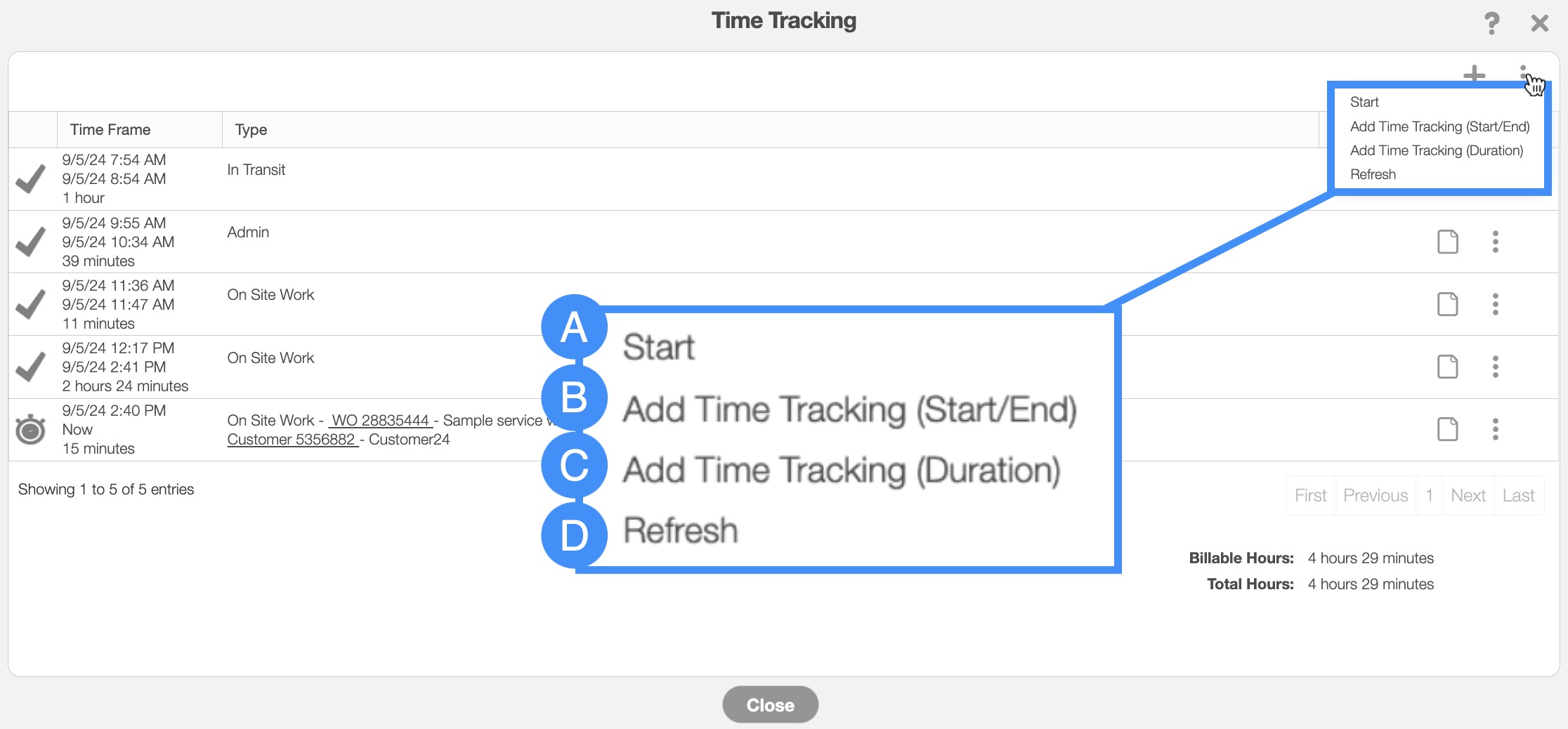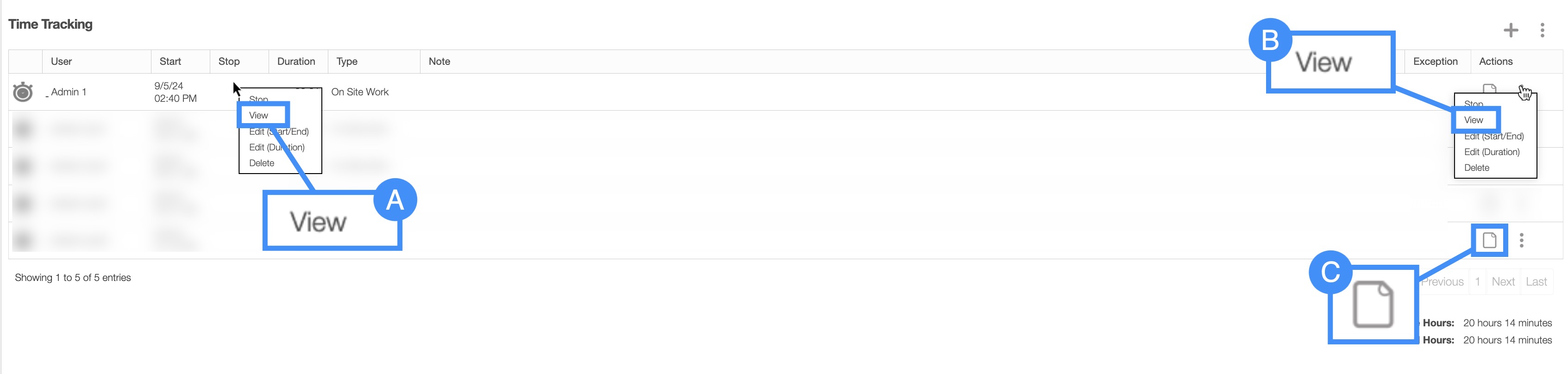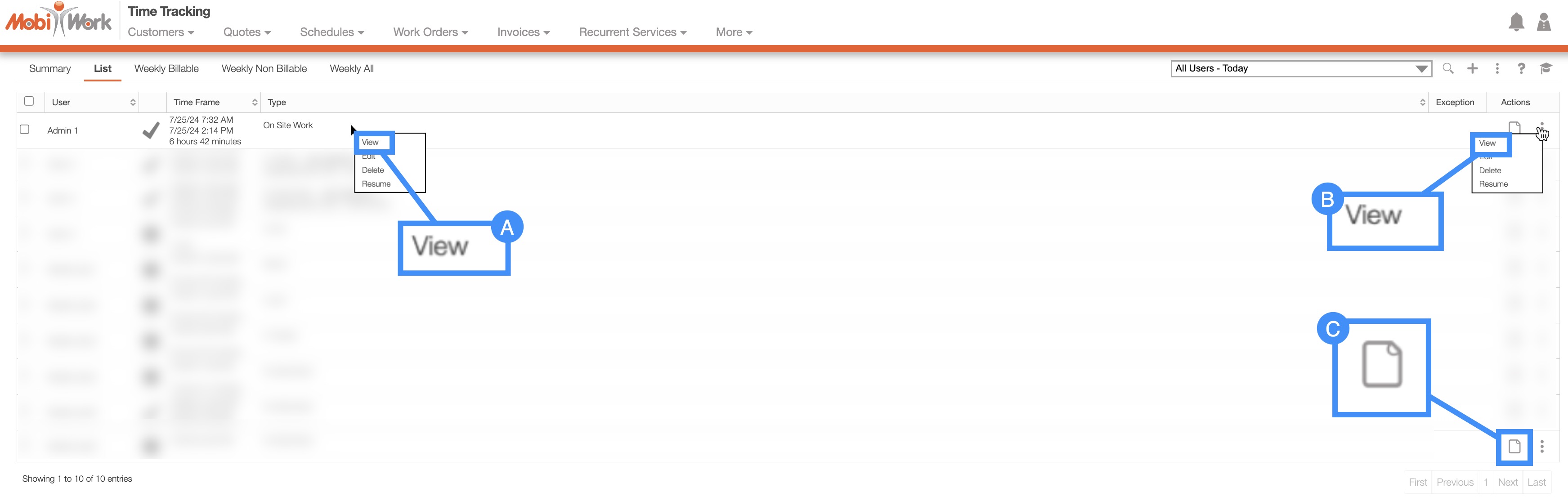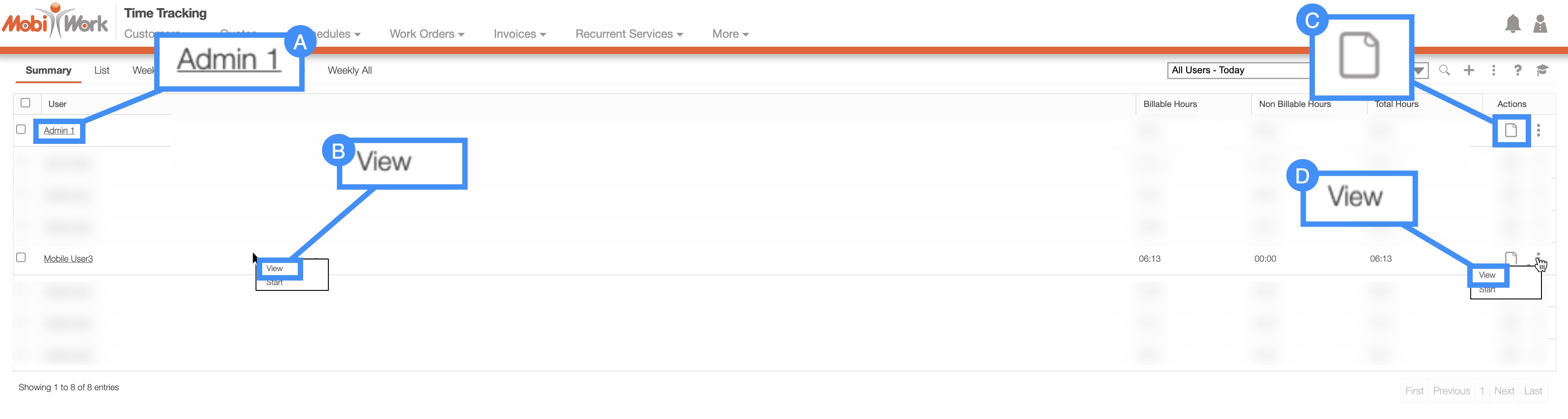 There are several different ways you can access the View Time Tracking pop-up windows in MobiWork.