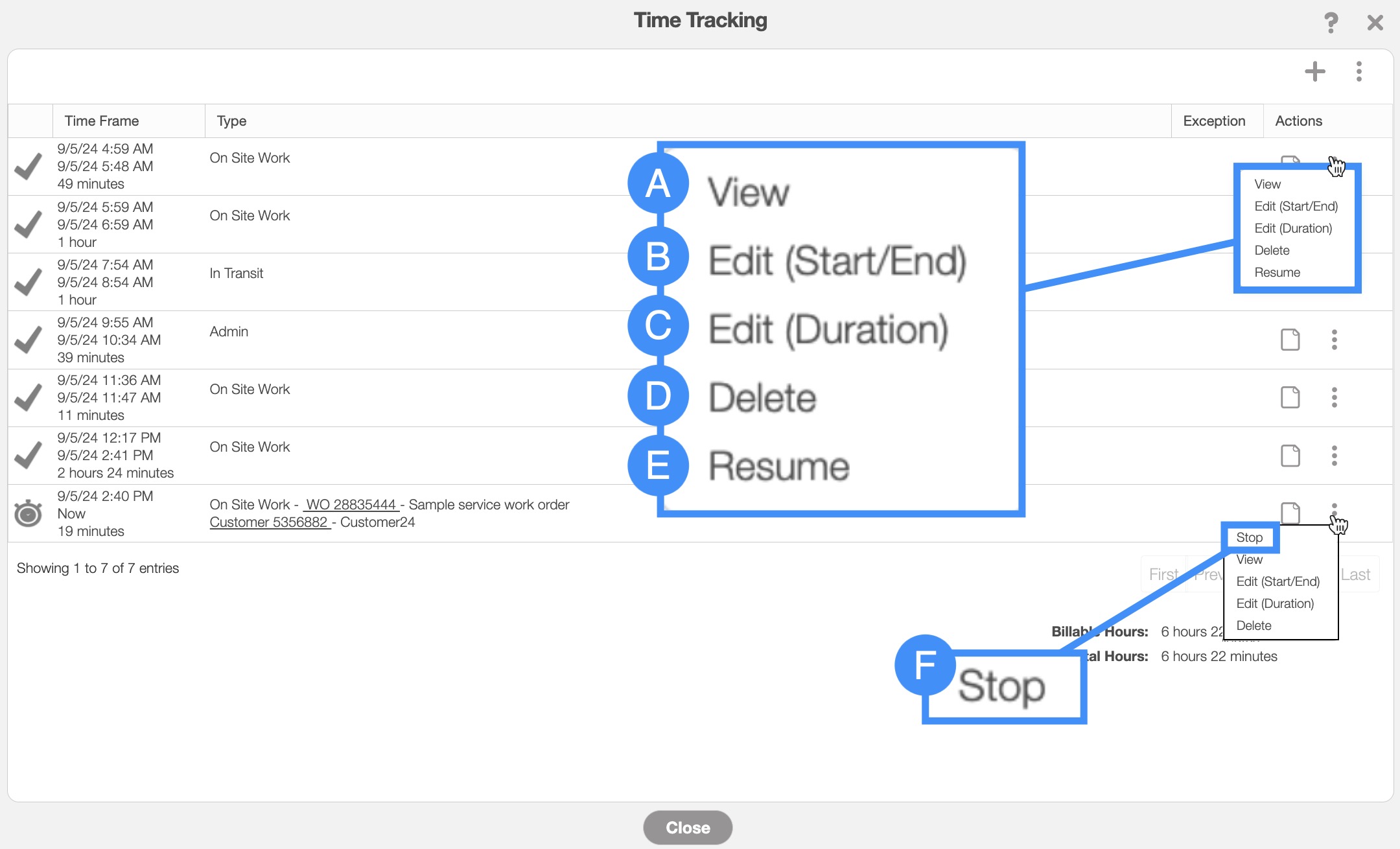 The following sections demonstrate some common methods of accessing the View Time Tracking pop-up windows from your MobiWork web platform.