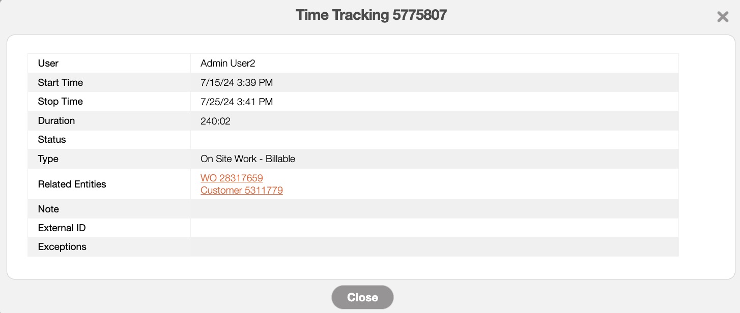 The duration of the time tracking entry, the start/stop time, status, notes, and more can be found in this pop-up window. The View Time Tracking Summary pop-up window can be accessed through the View Work Order pop-up window, and through the Time Tracking "List" tab.