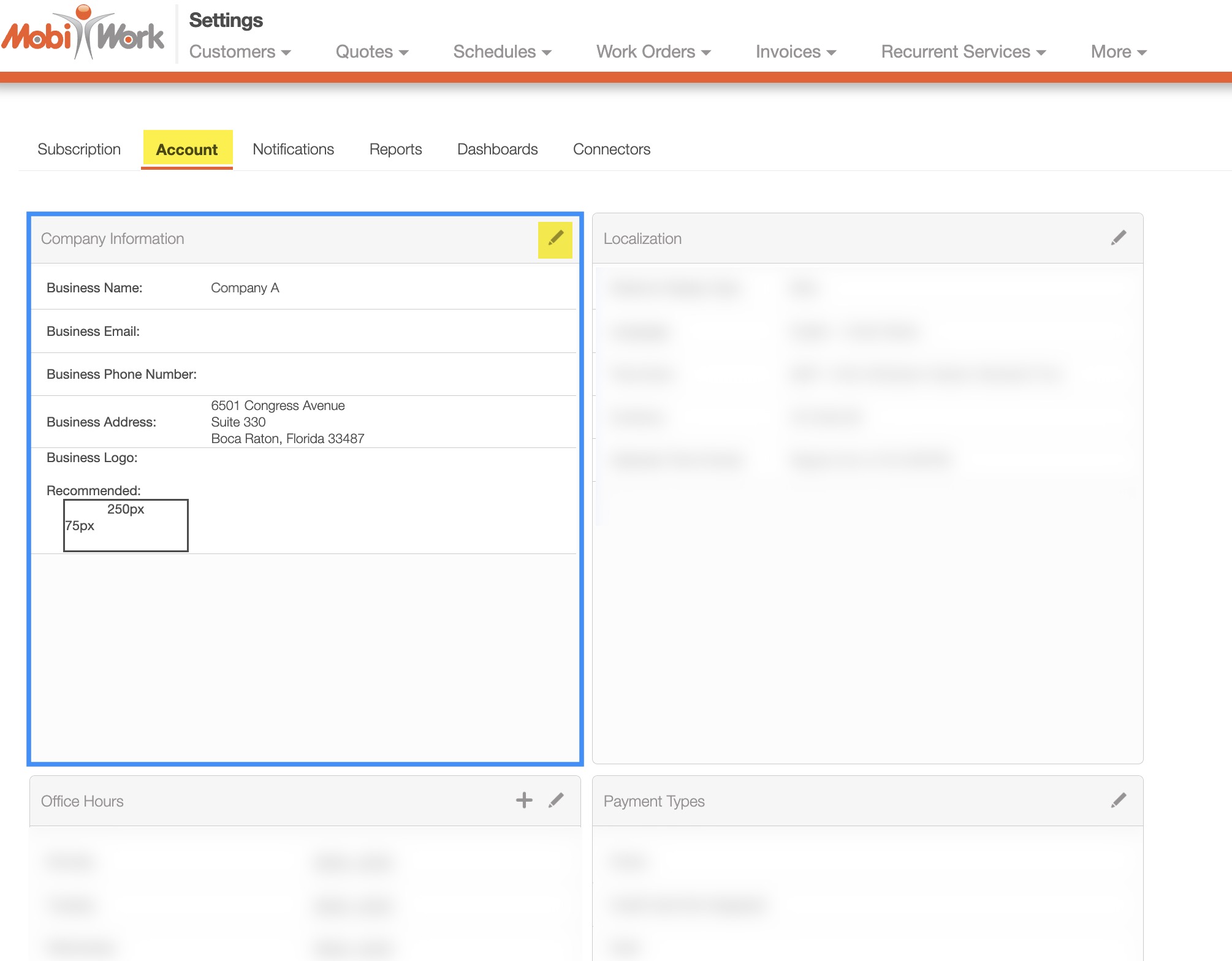 You can upload an image of your business logo to MobiWork. This image will be used in emails sent from your MobiWork account, as well as on invoices (web and PDF), quotes (web and PDF), and the mobile device.