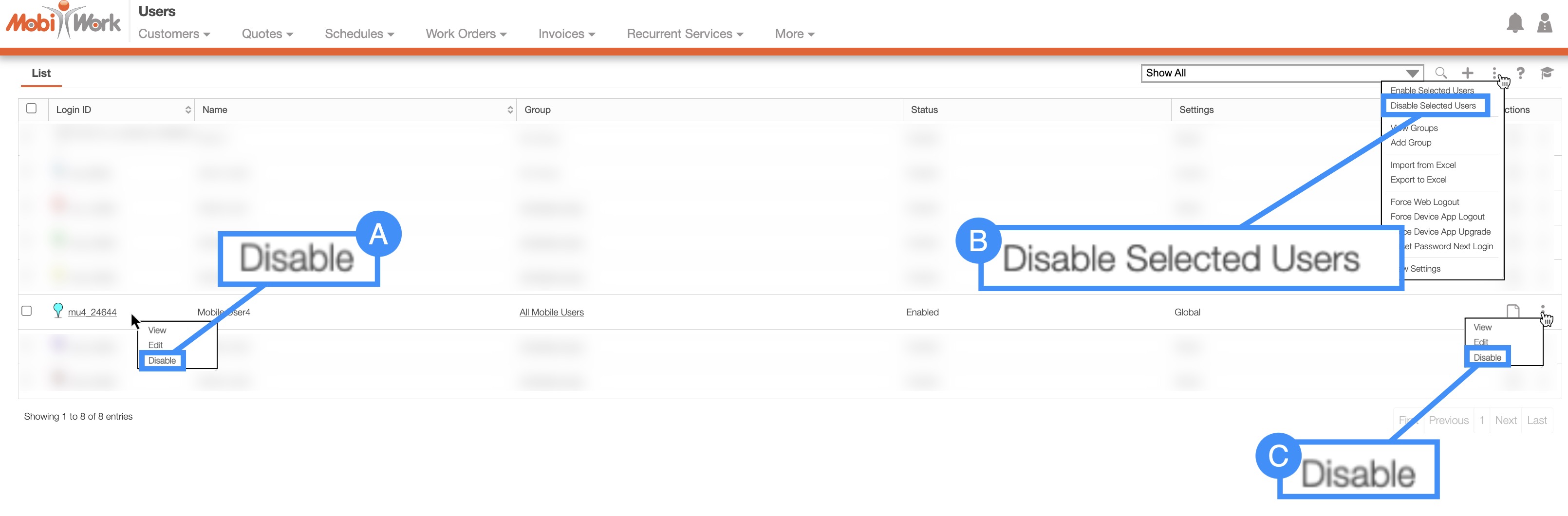 Important: Please note that if you disable a user, you will have to manually reassign all the assigned jobs and customers (e.g., recurrent services, recurrent routes, work orders, etc.).