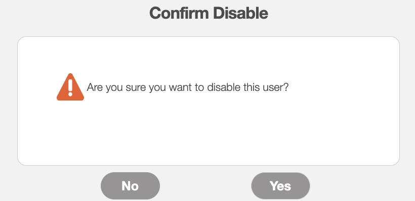 Regardless of the option that you choose the Confirm Disable pop-up window will appear. Select the Yes button to confirm you would like to disable the selected user: