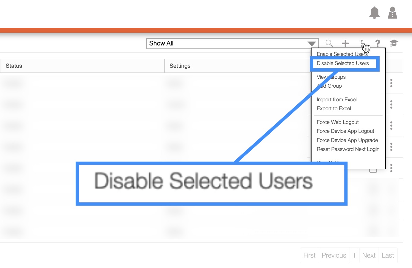 Select the More Actions button and from the drop-down, select the "Disable Selected" option. Please note that this option will give you the ability to disable multiple users at once.