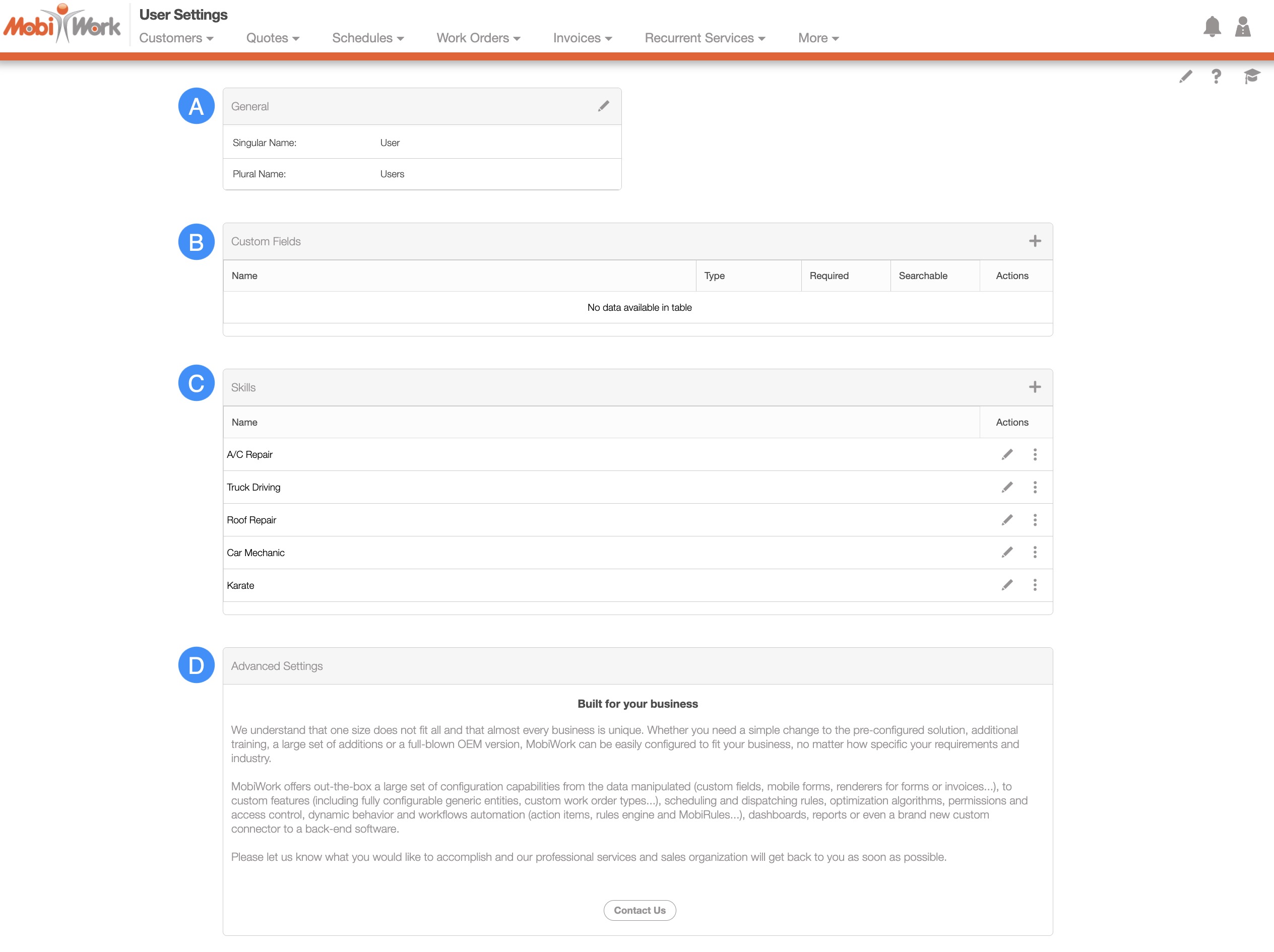 Unlock the full potential of your MobiWork experience with the Settings page! Tailor MobiWork to fit your business needs by effortlessly adding or editing user skills- these skills can be used for work orders that require additional requirements or certifications.