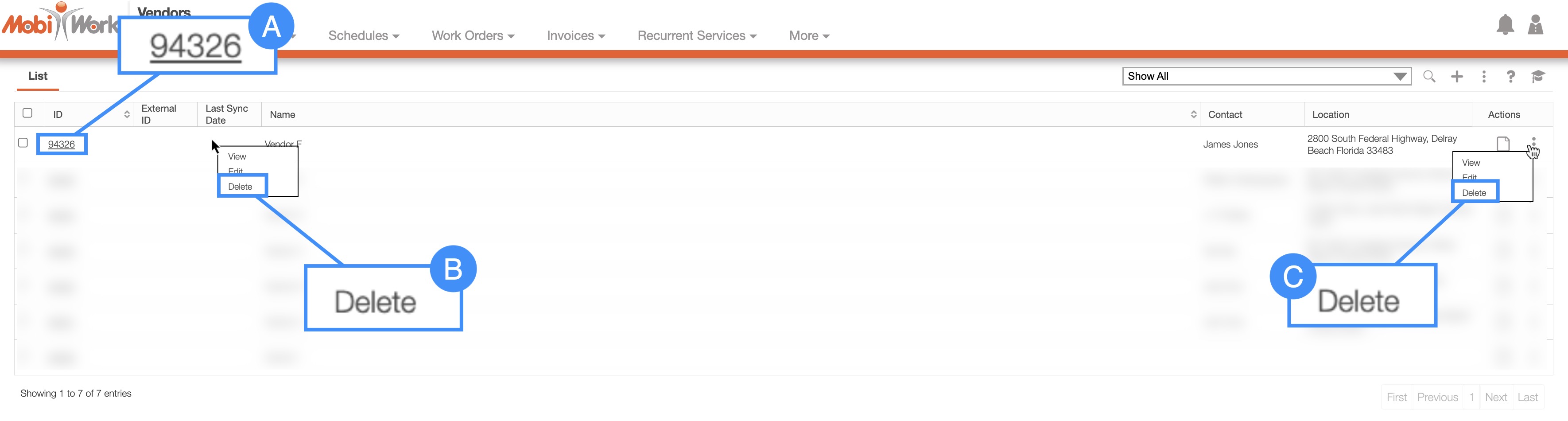 MobiWork provides multiple options for deleting vendors directly from the Vendor List page, offering an intuitive and efficient approach to vendor management. The following sections outline the various ways to access this feature.