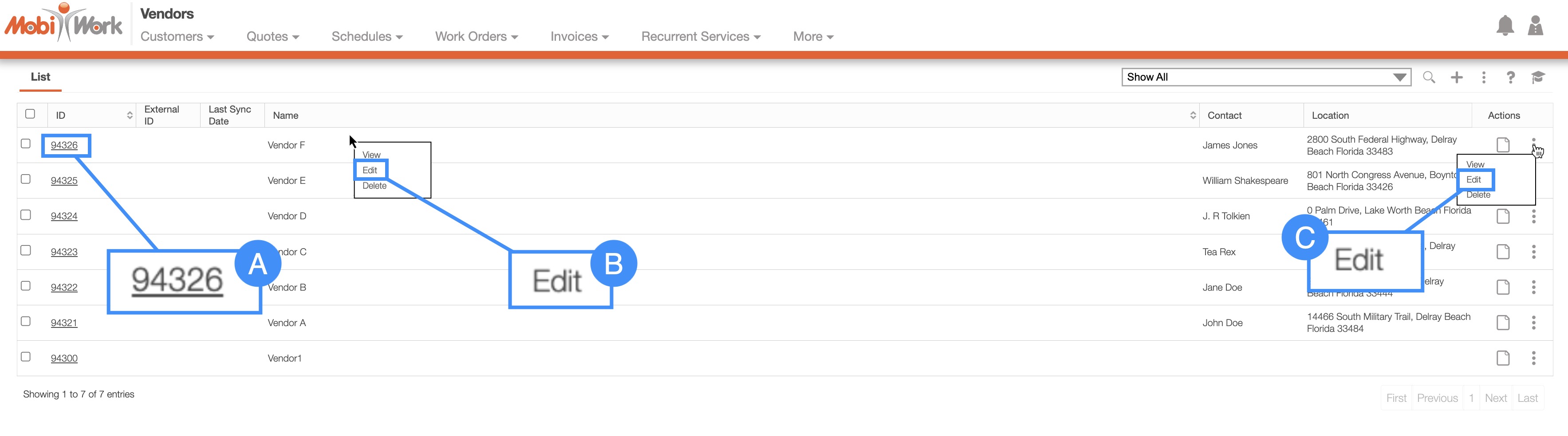 There are several different ways to edit an individual vendor. The section, How to Access the Page, will illustrate how to access the Edit Vendor pop-up window.