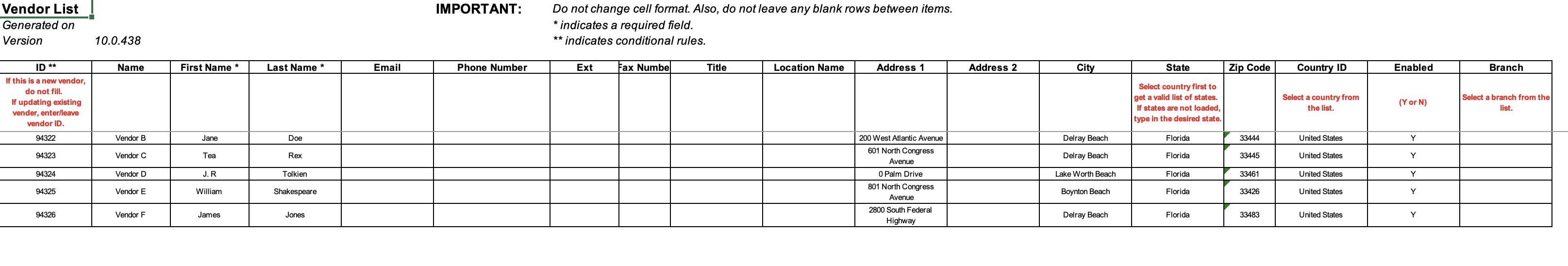 Once you are done updating your vendors, you can import the Excel file back into MobiWork. For more information on how to import vendors, please see the Import and Export Vendors page.