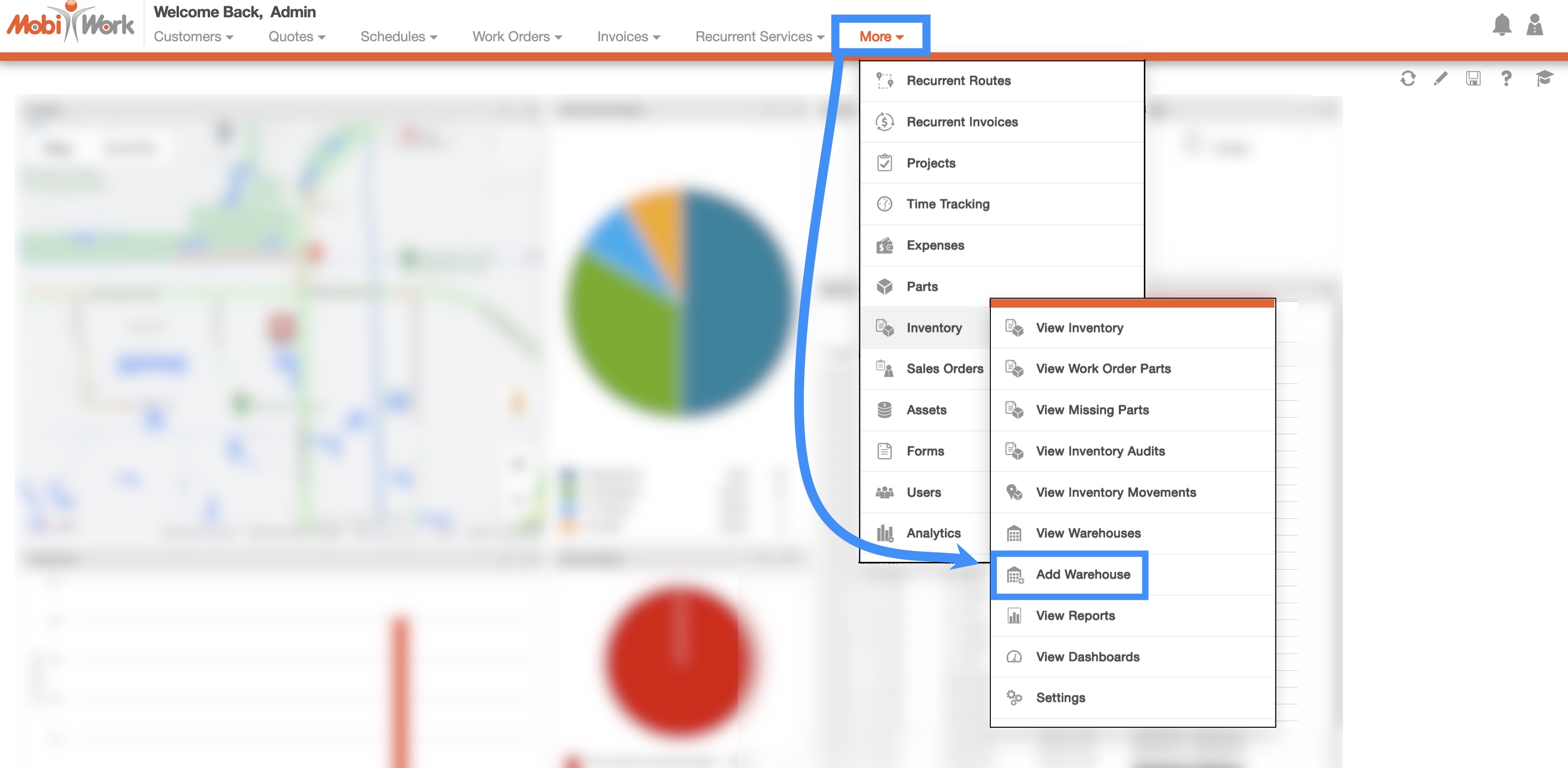 - The fastest and easiest way to add a new warehouse is by accessing the drop-down menu from the Inventory feature located in your MobiWork menu: